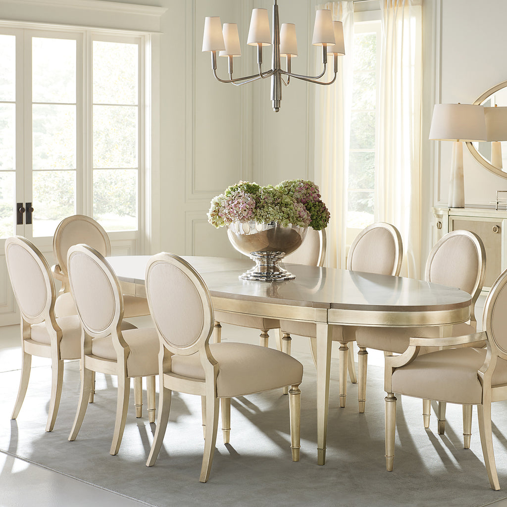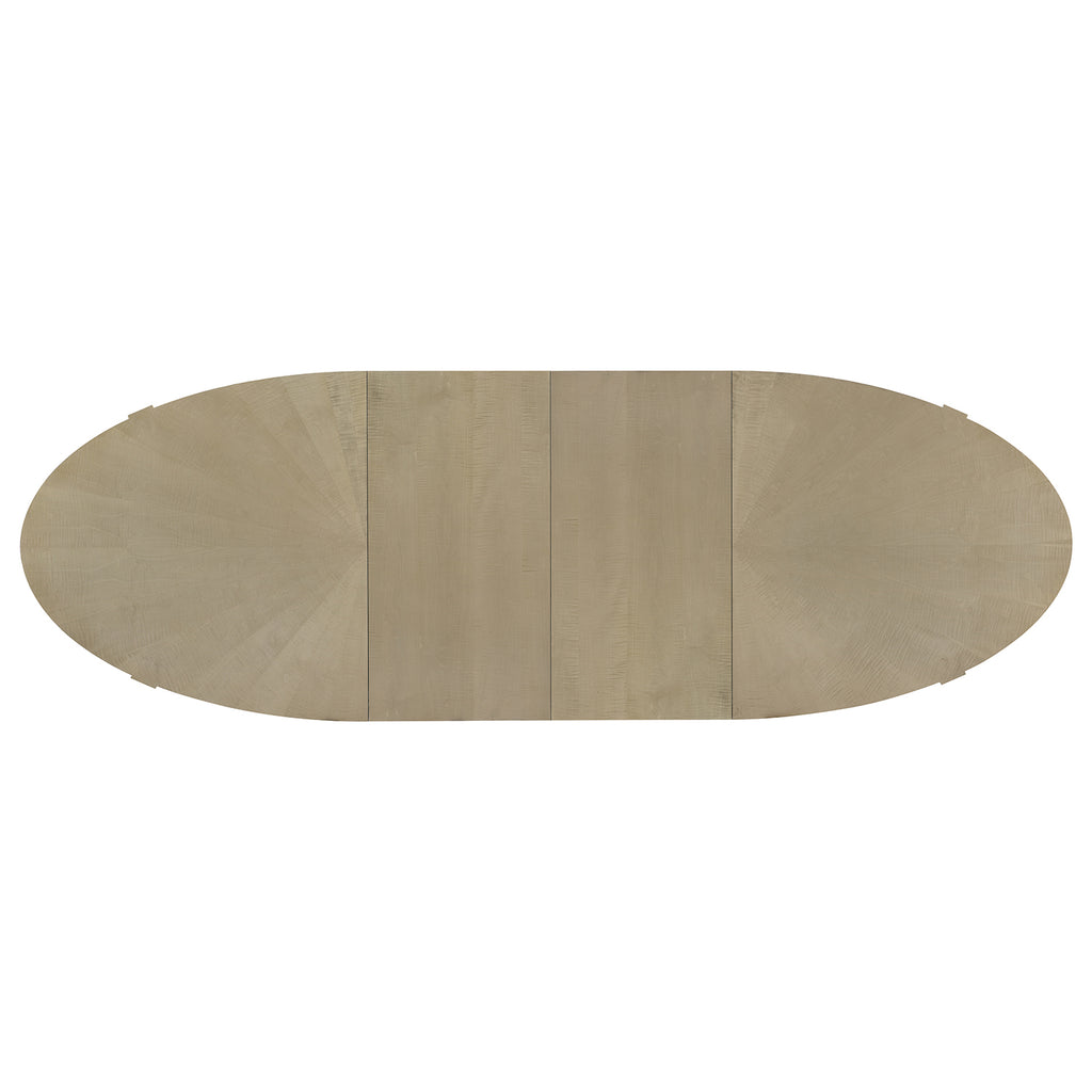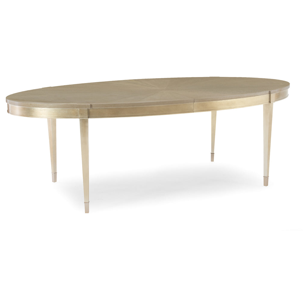 You’ll be inspired to gather friends and family more often with this lovely oval dining table. Its exquisite top features radial-matched Fumed Figured Tiger Maple veneers and is finished in Smoke with Taupe Silver Leaf accents. Ensuring room for everyone, the table extends to 138 inches with its two 24 inch leaves. Metal ferrules adorn its legs for a dramatic finishing touch.