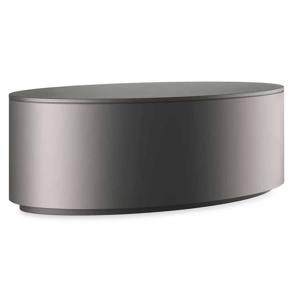 A wide, smooth-surfaced case gleams in Deep Bronze to make his oval cocktail table the perfect modern touch in front of a sofa. The top is Brushed Deep Bronze metal. The plinth base is Almost Black with hidden casters for mobility.