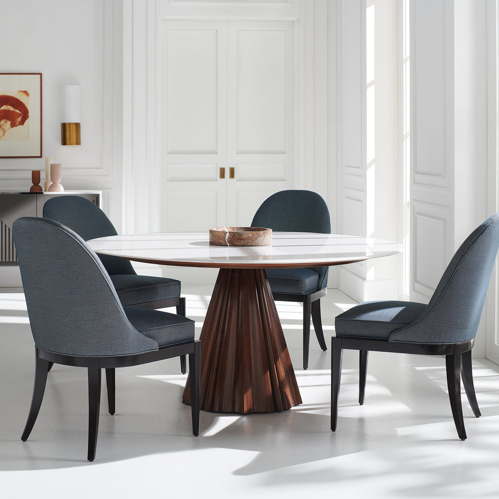 The designer’s artistic vision of finding balance against all odds, this sculptural dining table embodies harmony found in nature. Playing up light and shadows, a carved walnut base adds dimension and a sense of movement to dining interiors. Designed with a reverse bevel, its veined white marble top creates the illusion of a thin stone resting on its conical base. Intimate and intentional, it elevates entertaining and quiet evenings in. Comfortably seats 4 to 6.