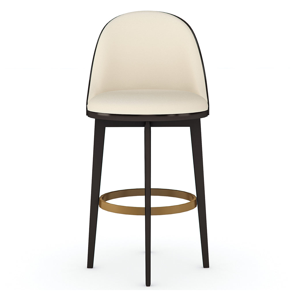 Luxuriously dressed in an embossed vegan leather, this elegant modern bar stool invites you to linger over coffee and mimosas at the breakfast counter. Features a comfortably curved back in a Dark Chocolate stained wood, perfectly poised on tall tapered legs. A metal hoop in Champagne Gold, set at just the right height for getting in and out, adds shimmer and gives leverage to swivel with ease. Pairs well with elevated desks and workstations.