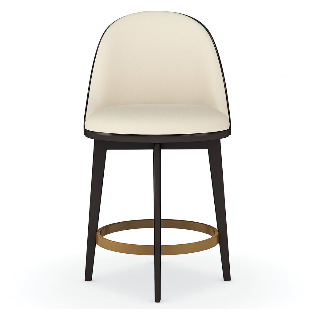 Luxuriously dressed in an embossed vegan leather, this elegant modern counter stool invites you to linger over coffee and mimosas at the breakfast counter. Features a comfortably curved back in a Dark Chocolate stained wood, perfectly poised on tall tapered legs. A metal hoop in Champagne Gold, set at just the right height for getting in and out, adds shimmer and gives leverage to swivel with ease. Pairs well with elevated desks and workstations.