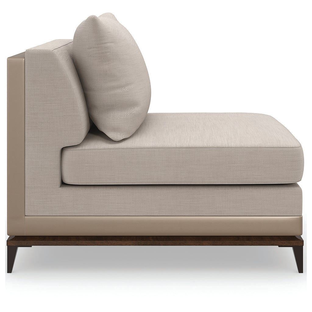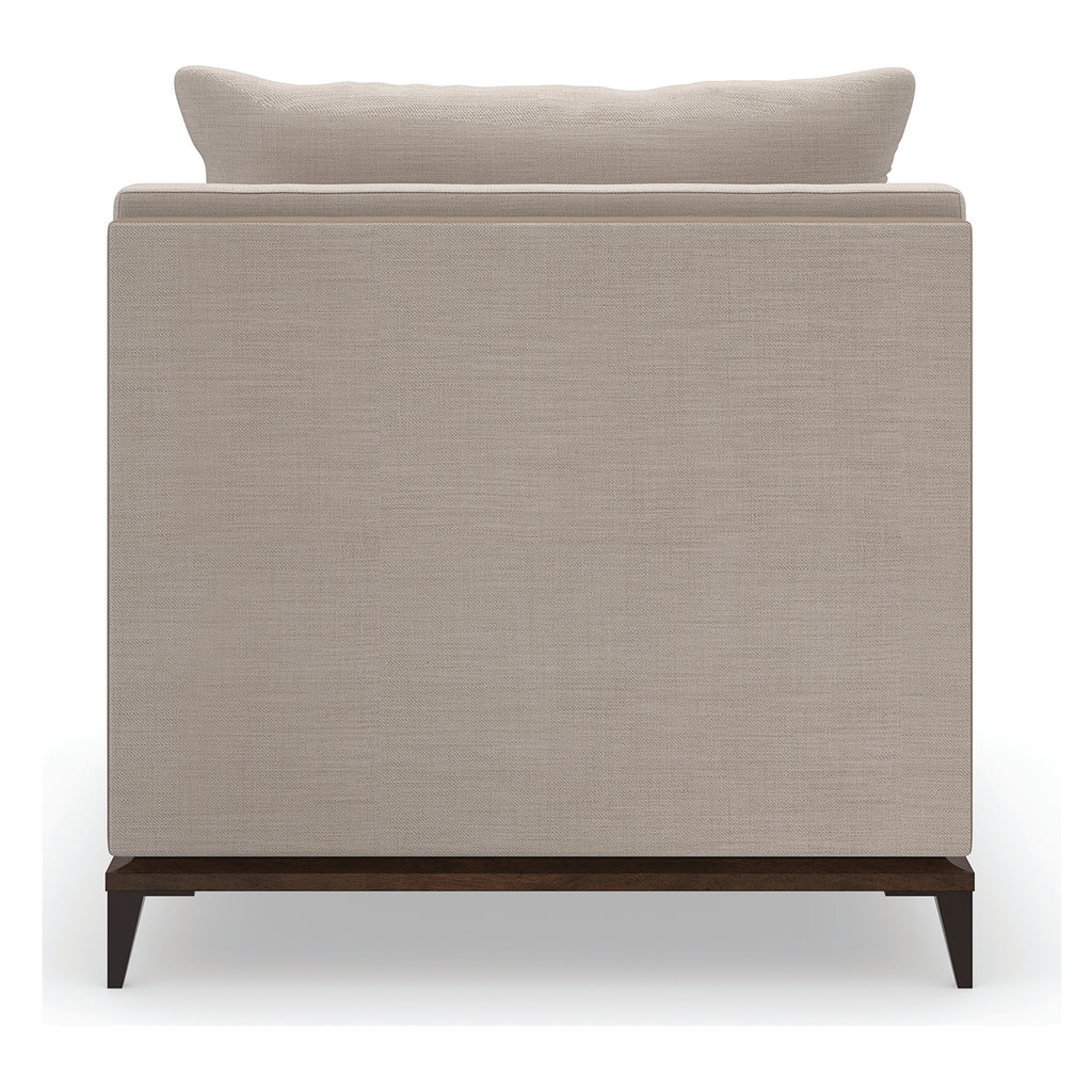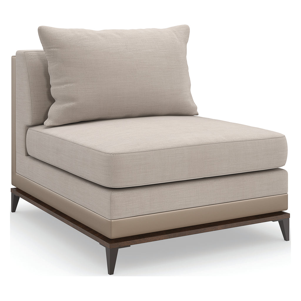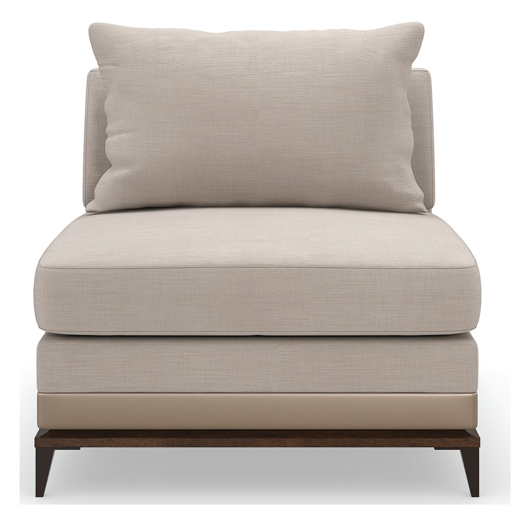 With numerous configurations and options for in-the-moment customization, the Archipelago collection introduces a relaxed sit with a refined aesthetic. Upholstered in a neutral twill fabric with a faux leather accent, and elevated on an exposed Bourbon Glaze wood base with metal legs in a Deep Bronze finish.