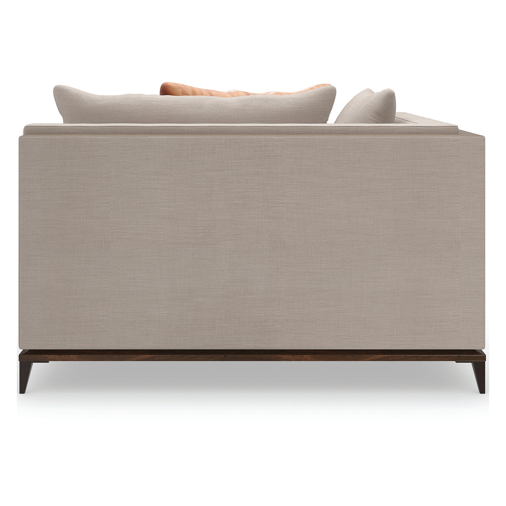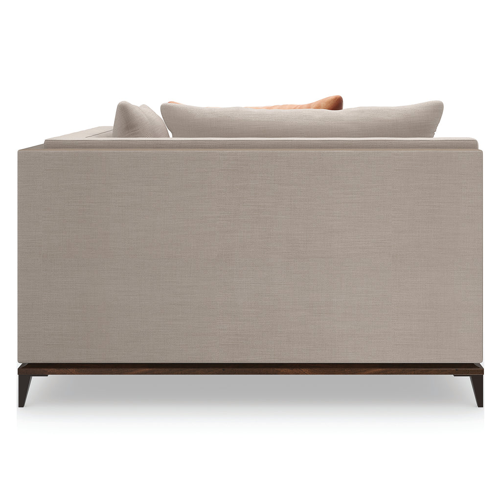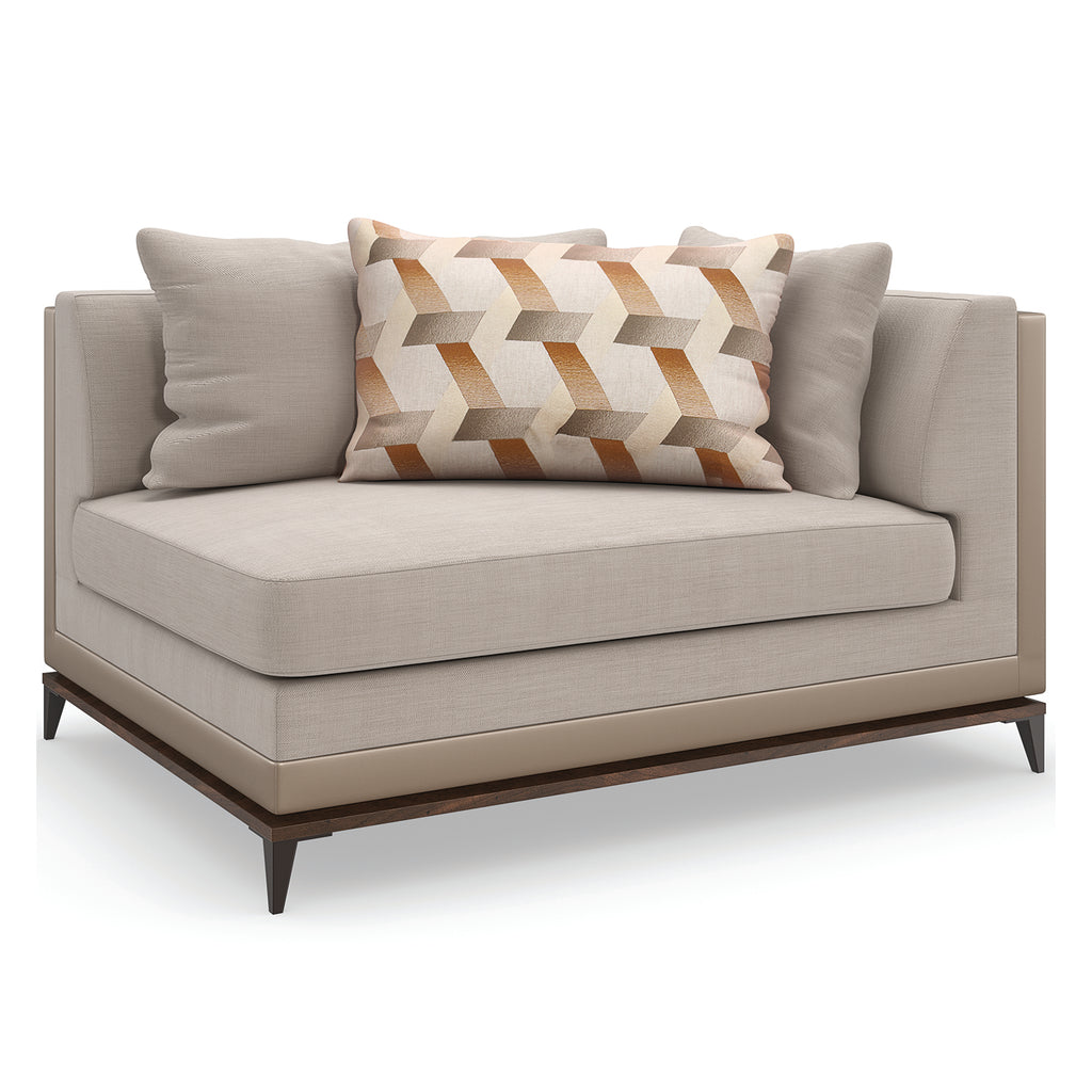 With numerous configurations and options for in-the-moment customization, the Archipelago collection introduces a relaxed sit with a refined aesthetic. Upholstered in a neutral twill fabric with a faux leather accent, and elevated on an exposed Bourbon Glaze wood base with metal legs in a Deep Bronze finish. Style luxe down pillows with a color-blocked expression of saffron velvet, or reverse to display an embroidered, geometric pattern.