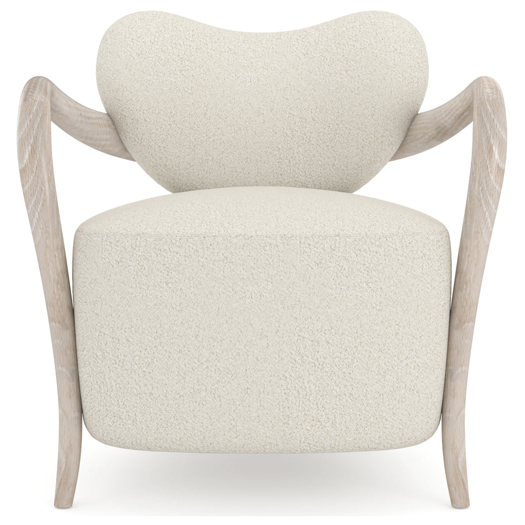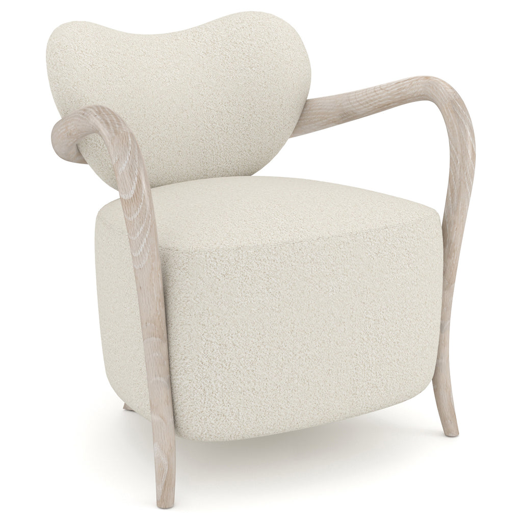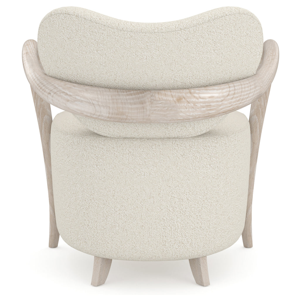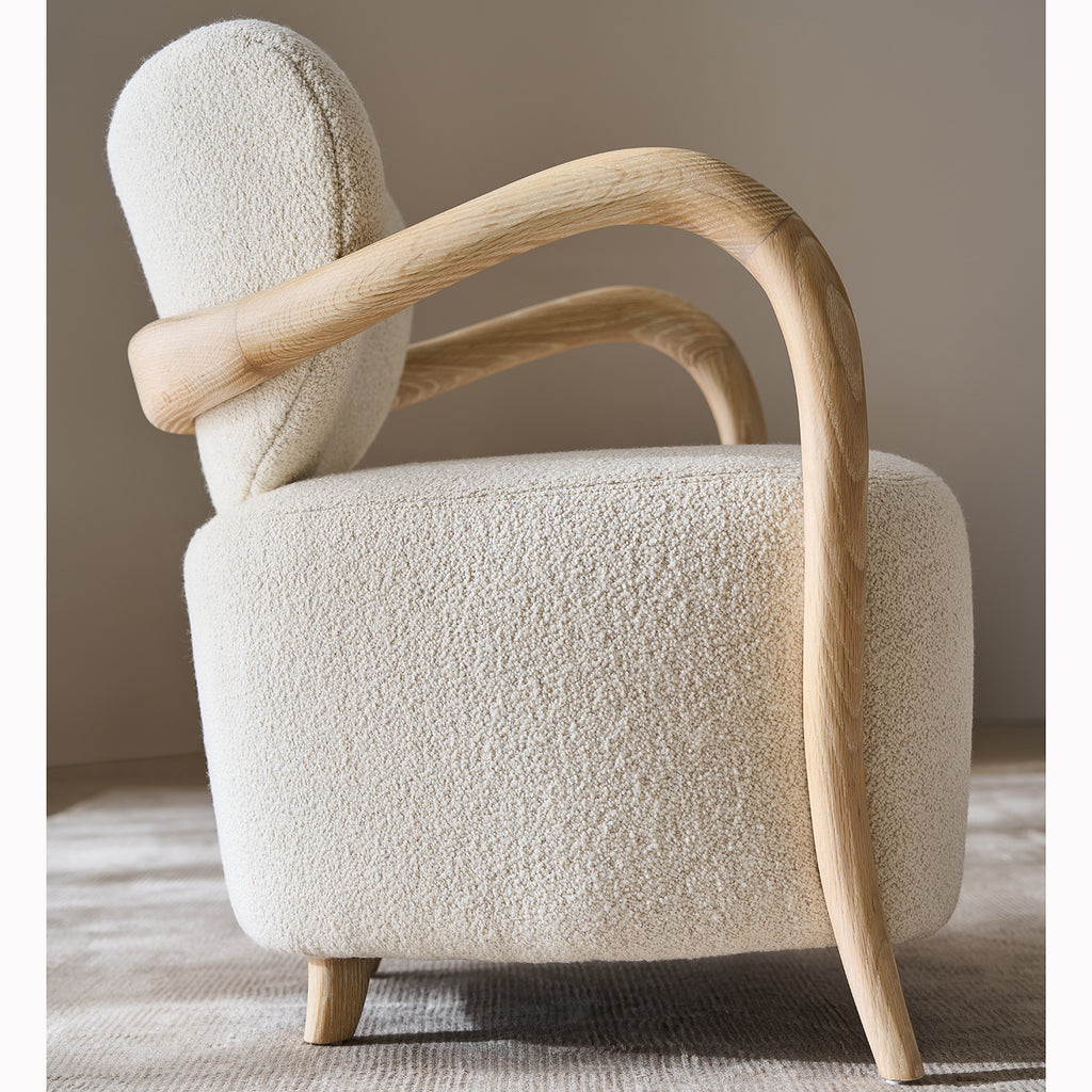 This chair is a celebration of the beautiful wood carving and woven fabrics of Africa. This is a modernized klismos chair with a gravitas that comes from its exaggerated deep and tight-upholstered seat and plush upholstered concaved backrest all in Ivory Mélange Performance Bouclé. The curved, and gracefully tapered Red Oak legs, sweep forward at the front and backward at the rear and have a sand-blasted look with their Sun Drenched Oak finish.