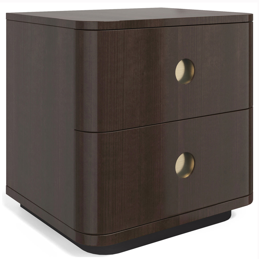 This masculine nightstand uses hand-applied Tupelo veneers with a high-gloss Otter finish to achieve its handsome demeanor. The three drawers have rounded front edges and are punctuated by three recessed porthole pulls in Champagne Gold. The soft-closing drawers open to deep cases finished in UV Noir. The Dark Chocolate base is reset as a finishing touch.