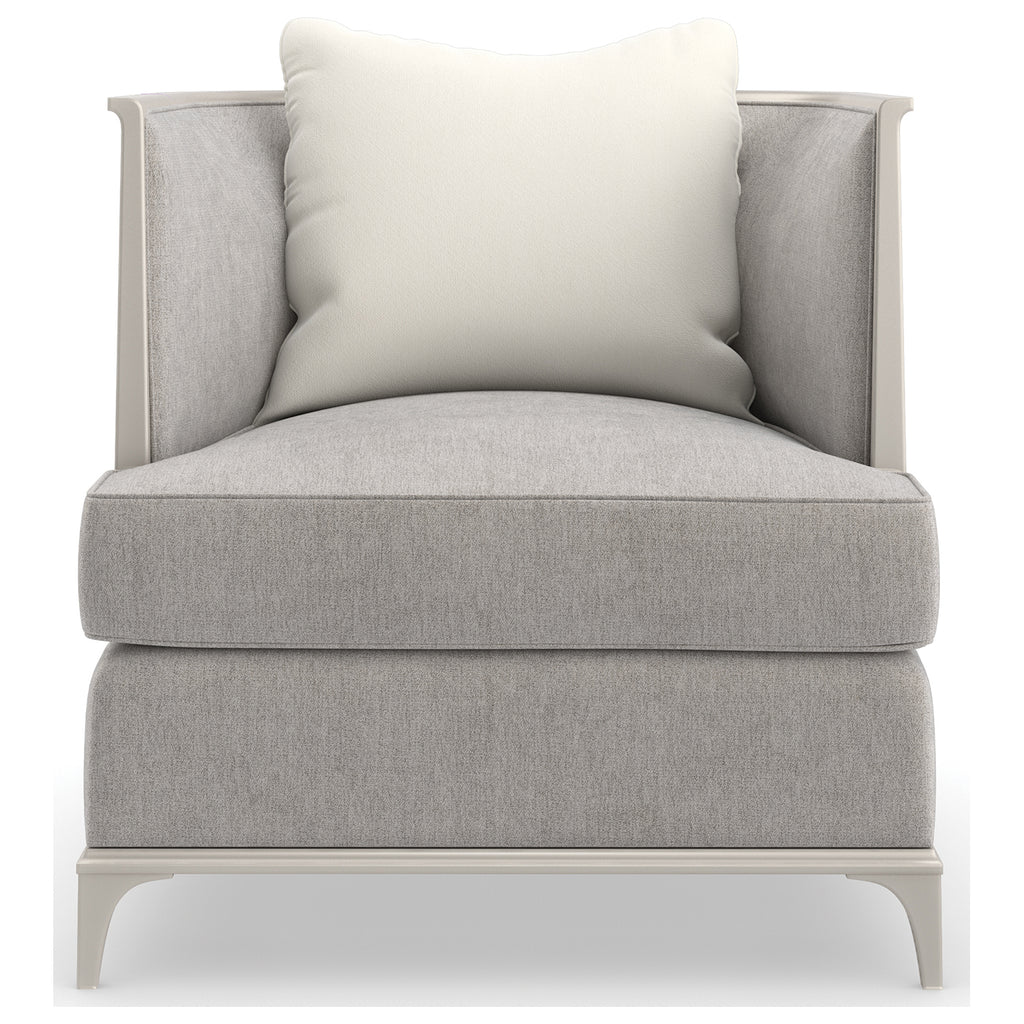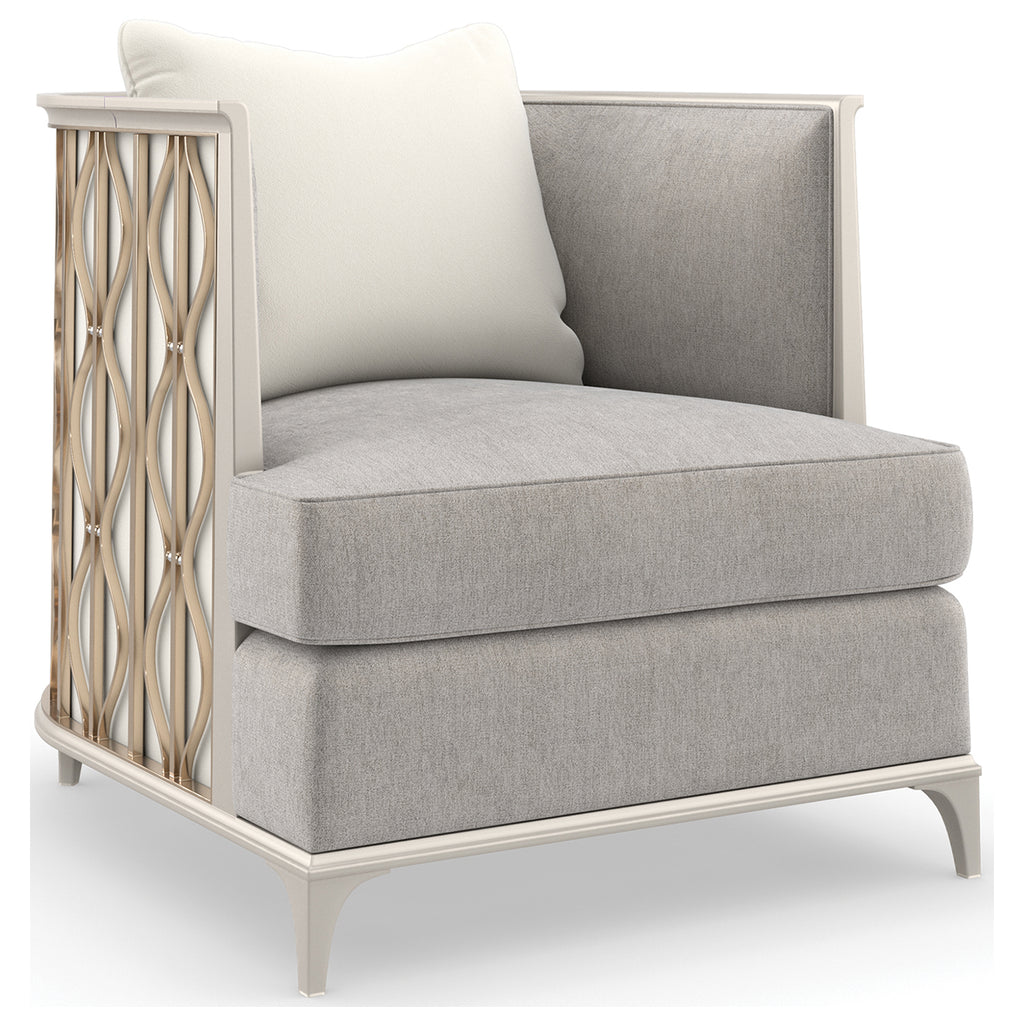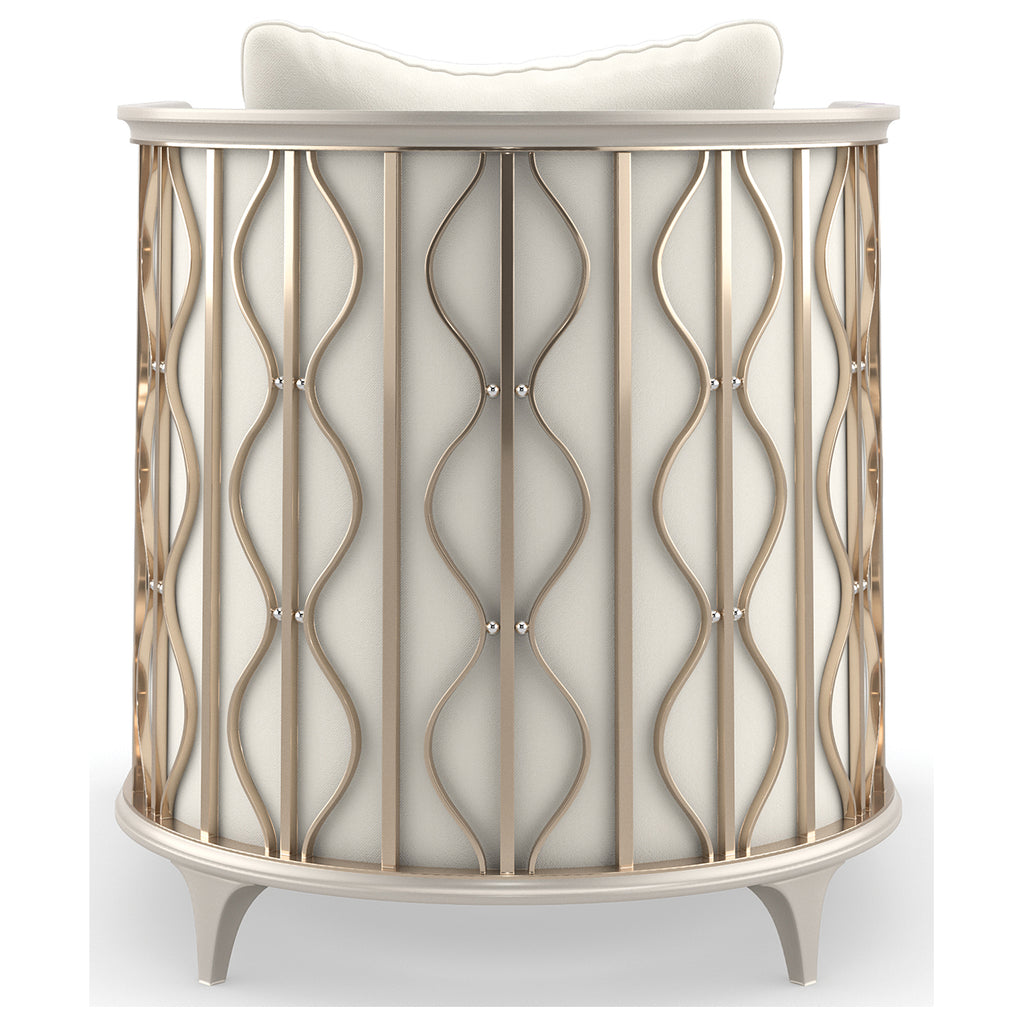 Artful and alluring in a luxe material mix, this lounge chair captures the tranquil beauty of gently swaying kelp ribbons beneath the waves in a coral reef. Accentuating its sheltering, barrel-style back: a shimmering layer of champagne faux silk framed beneath rippling metal bands and pearl-like beads in a Whisper of Gold for added dimension. The inside back and seat cushion are finely tailored in a silver micro-chenille performance fabric with gold foil accent yarns for added glimmer.