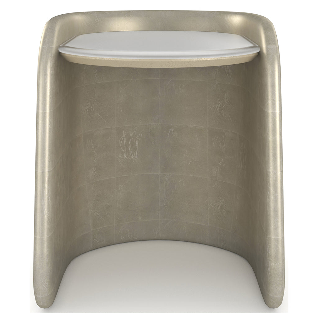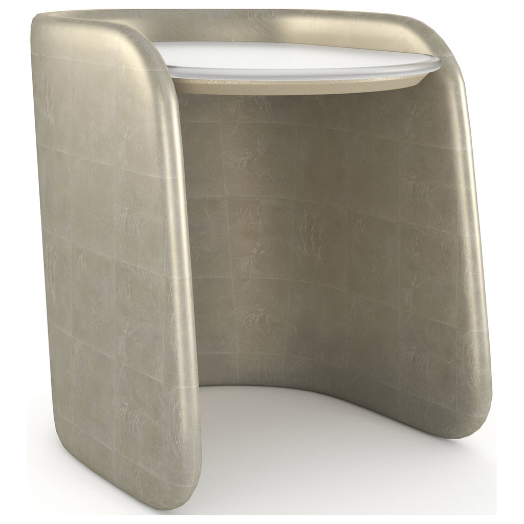 Reminiscent of asymmetrical jewelry cuffs by Elsa Peretti, Bauble’s gently flowing base wraps around a soft-frosted glass top, backed in white and peppered with delicate gold flecks. This piece is spectacular because the base’s finish has an undulating finish to reflect light; and the table is enrobed in a hand applied Oracle Broken Leaf that glimmers inside and out.