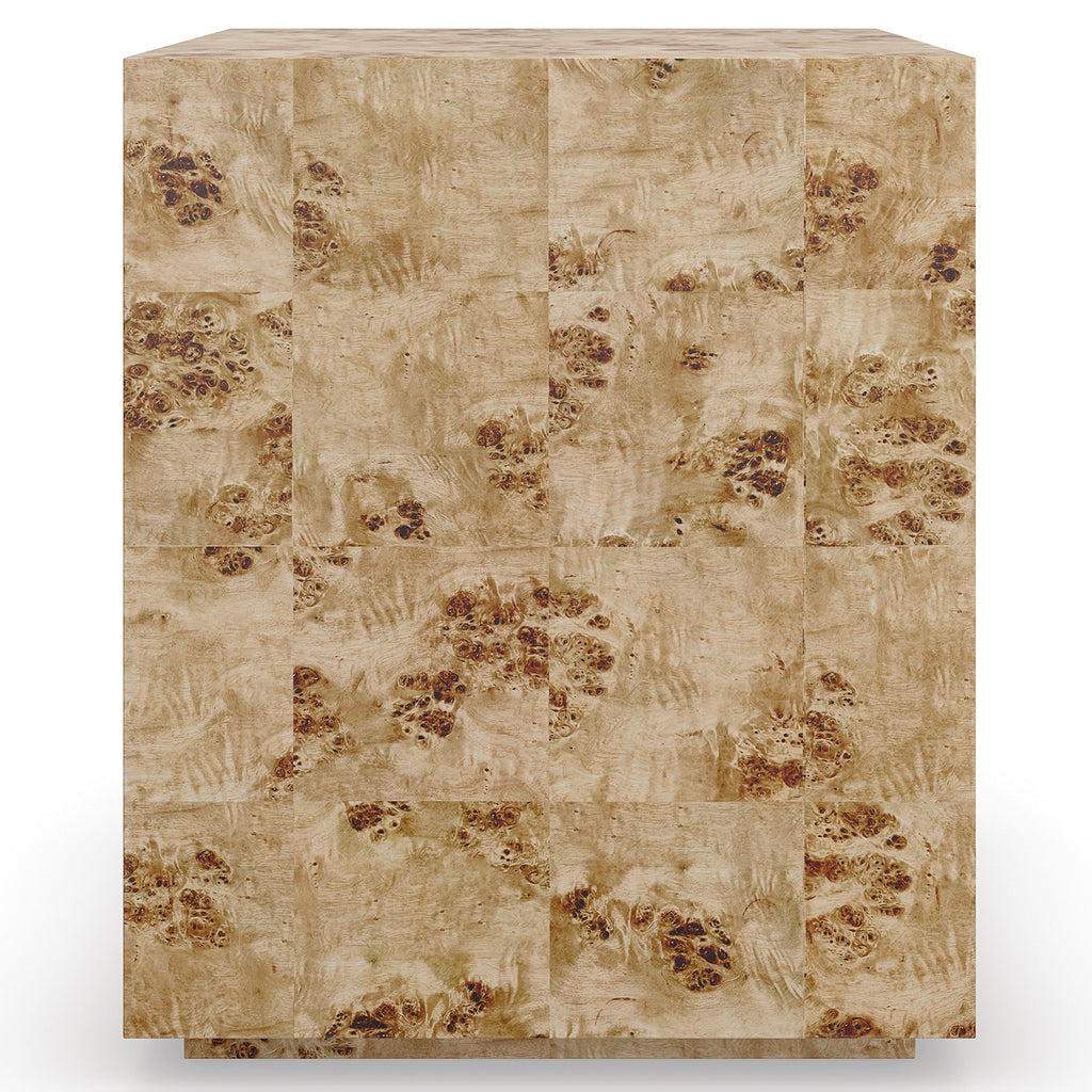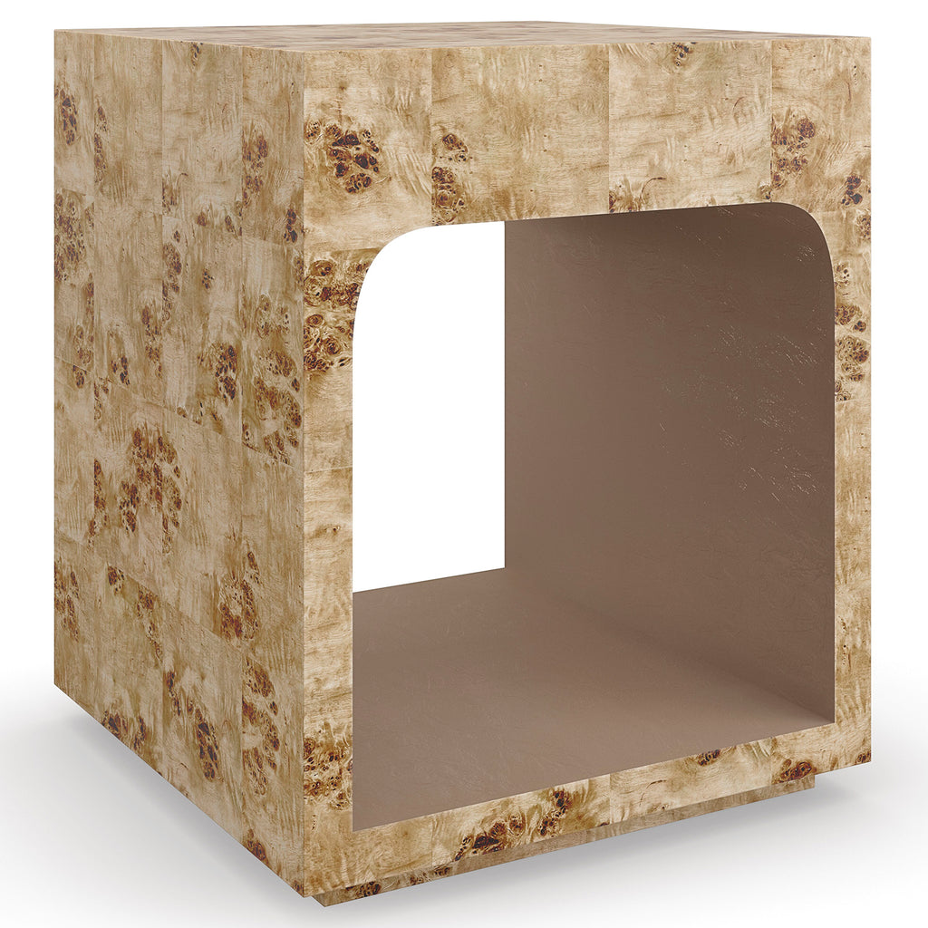 Crafted from exotic mappa burl veneers, intricately pieced to showcase its highly figured, swirling grain and interplay of light and dark tones. A Brazen bronze leaf finish underneath adds warm contrast and a soft glow. Features a single drawer and open space for displaying books and decor.