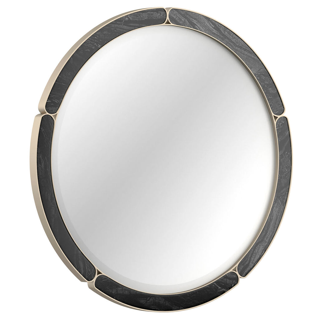 This one-inch beveled round mirror has been dressed up with highly figured black and gray stone inserts framed in Whisper of Gold metal. Little touches like the rounded edges of the marble inserts make this a special piece for many rooms.