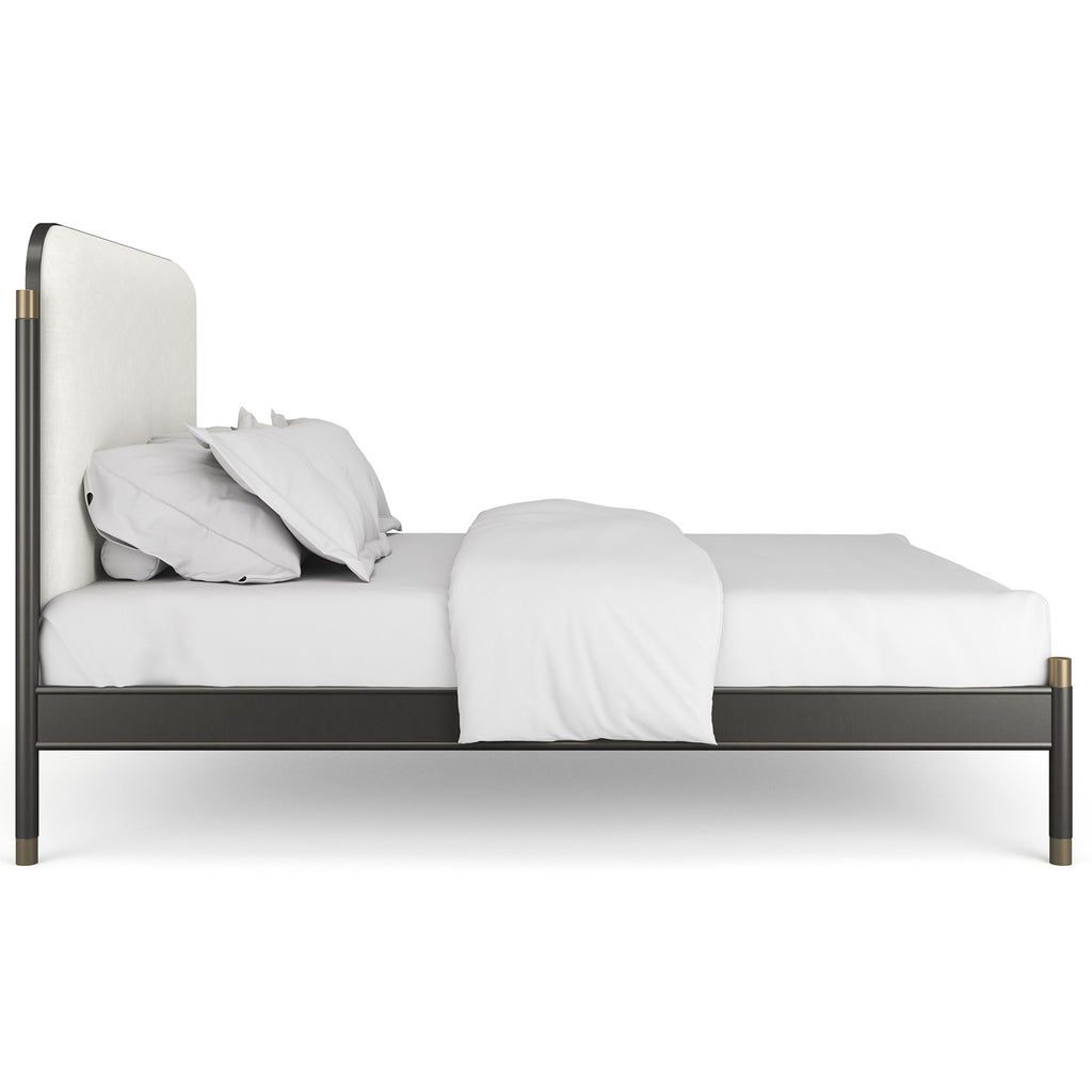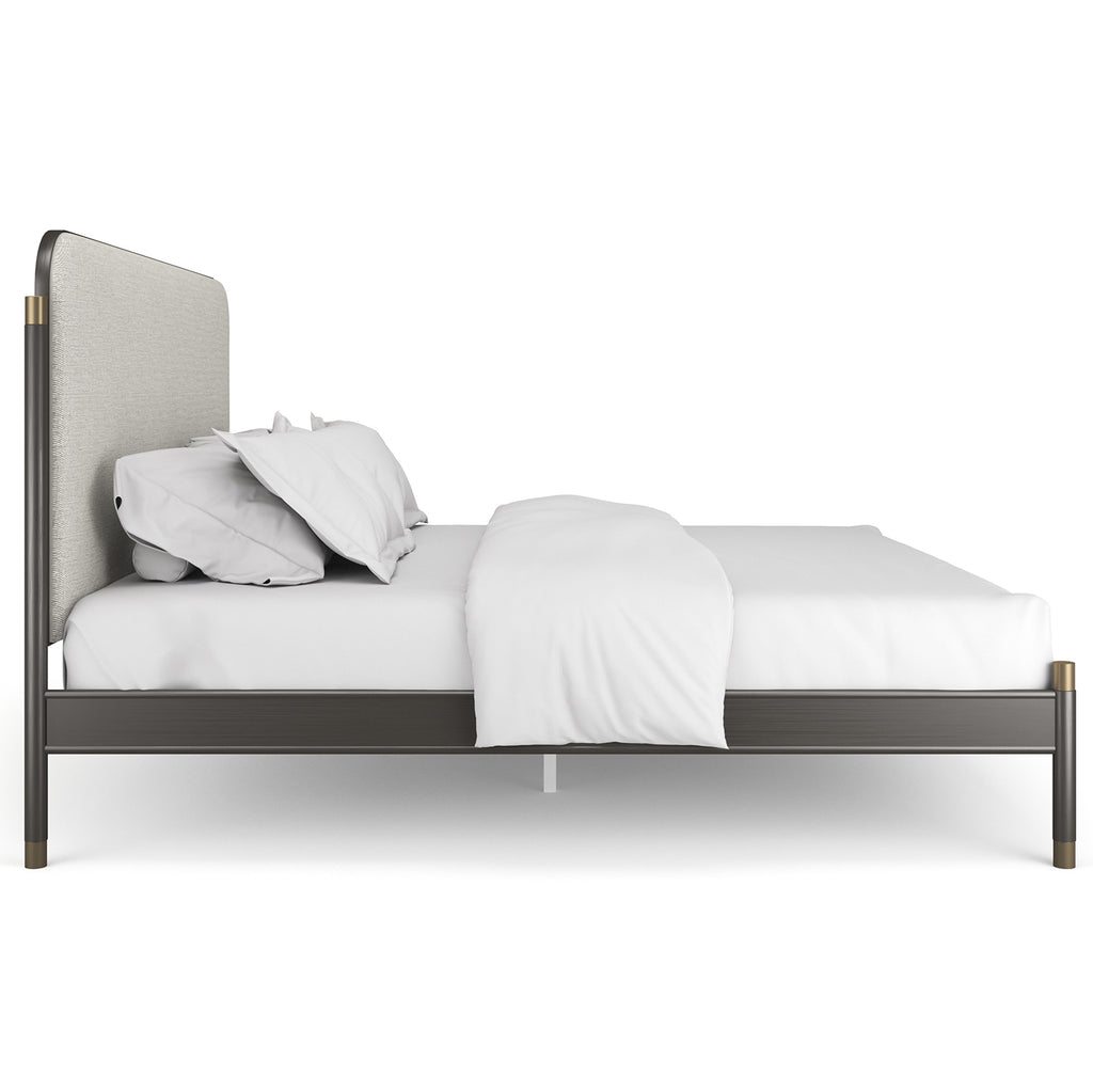 Metal campaign beds of the past get a new spin with this attractive mix of metal and upholstery in contrasting colors and textured finishes. Ivory linen-blend micro-ribbed fabric is applied to the headboard, footboard and side rails. Designed to be able to float in a room, the headboard is upholstered on both sides and framed in a Brushed Deep Bronze metal frame. Headboard trim and low finials glisten in Champagne Gold.