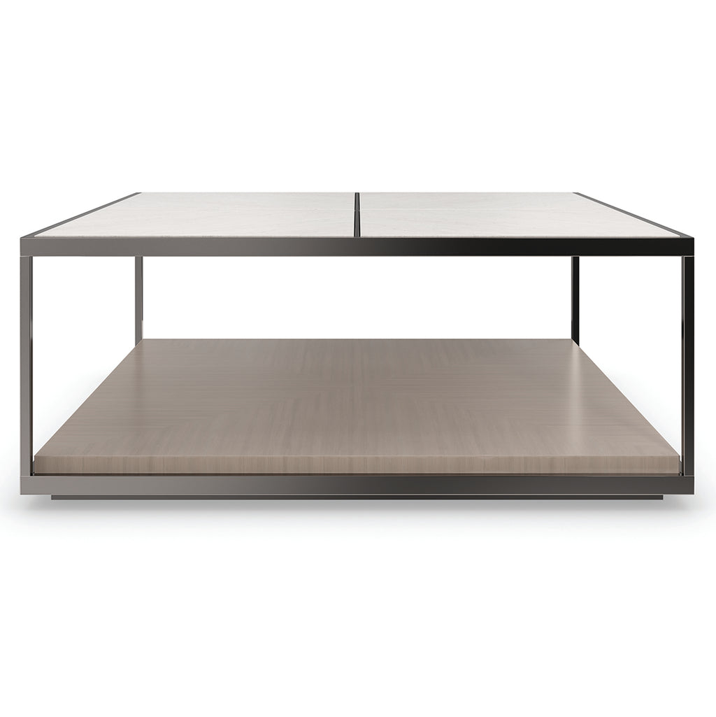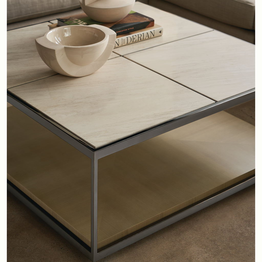 An ode to the art of symmetry and balance, this cocktail table takes inspiration from the Cartesian grid, named after French mathematician René Descartes. Perfectly proportioned with a minimalist aesthetic, it seamlessly aligns the beauty of wood with metal and stone. Offers ample space for displaying art books and decor. Hidden casters make it easy to move.