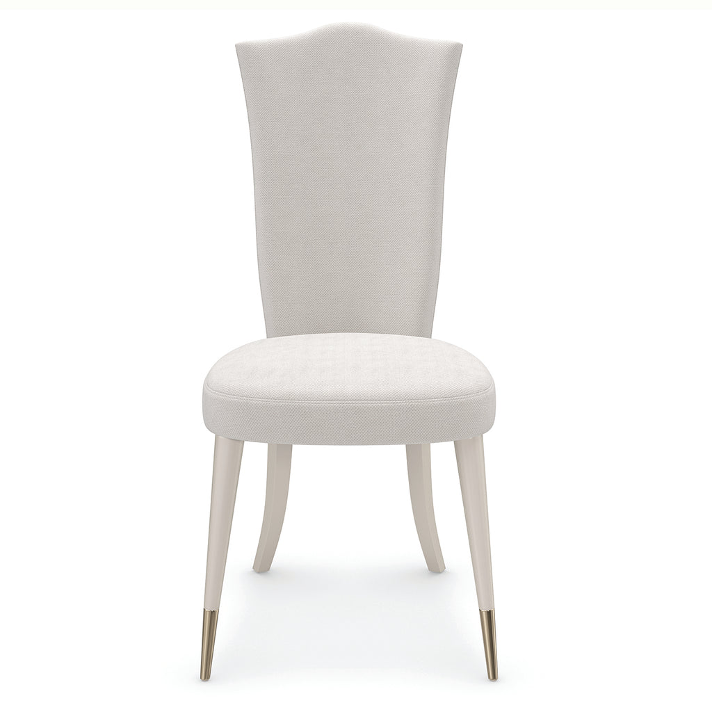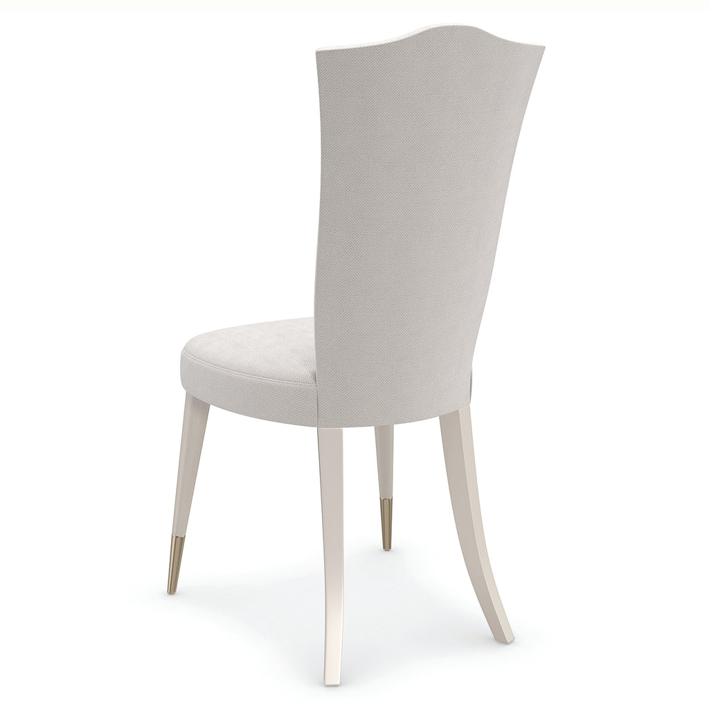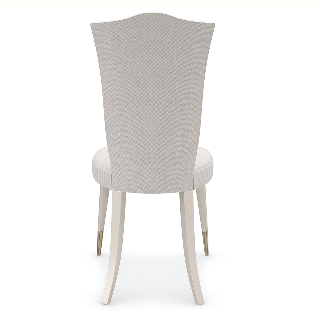 A classic camel back defines this sweetheart of a dining chair, designed with welcoming curves and lumbar support to comfortably seat guests. Fully upholstered with Matte Pearl legs, tapered on the front and capped in a Whisper of Gold metal ferrules. Cherub arm chair also available.