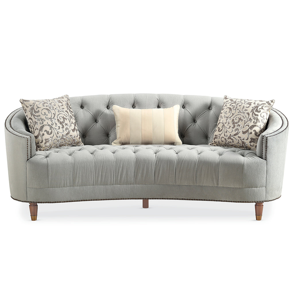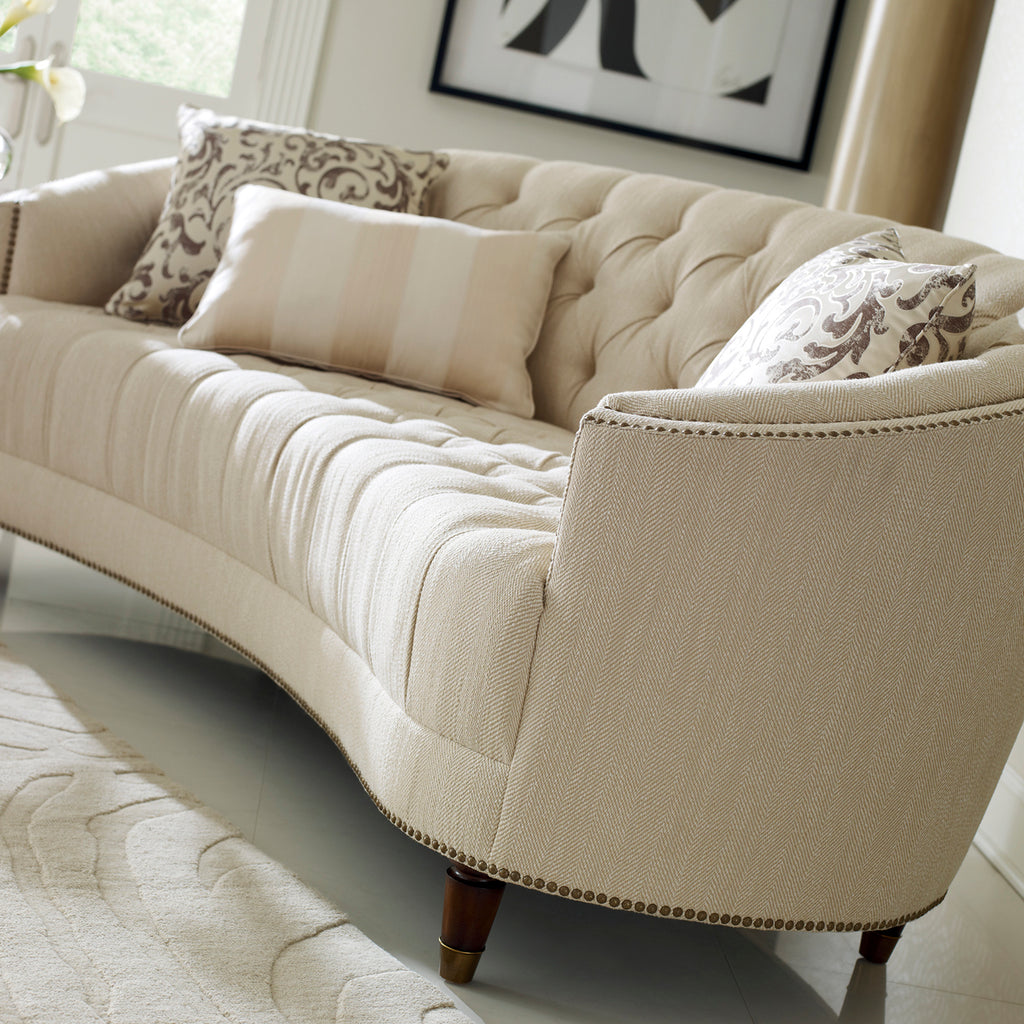 Curvaceous and shapely, with traditional elements like button-tufting and decorative nailhead trim, this bench seat sofa also conveys a modern sensibility covered in a subtle textured herringbone fabric, with metallic accents on the pillows. An antiqued metal ferrule caps the carved wood feet.