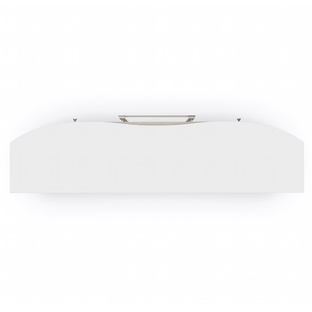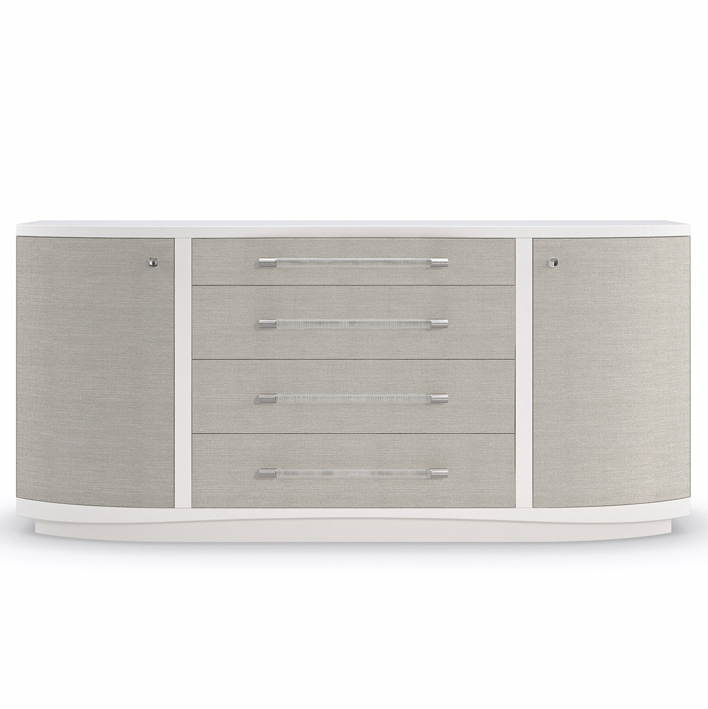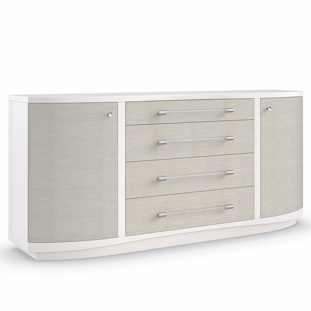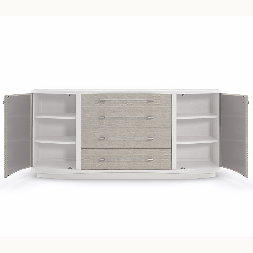 With inherent organic character, this dresser introduces a softly textured, metallic element to bedroom interiors. The natural beauty of woven raffia is reimagined in Sun-kissed Silver, complemented by ash veneers in a Pearly White finish. Acrylic drawer pulls capped with ribbed stainless steel and square knobs inscribed with a ginkgo leaf pattern lend a distinct finishing touch. Generous storage offers four spacious drawers and shelves behind each of the two end doors for aesthetically pleasing organization. Cutouts along the back allow for cord management and functional versatility.