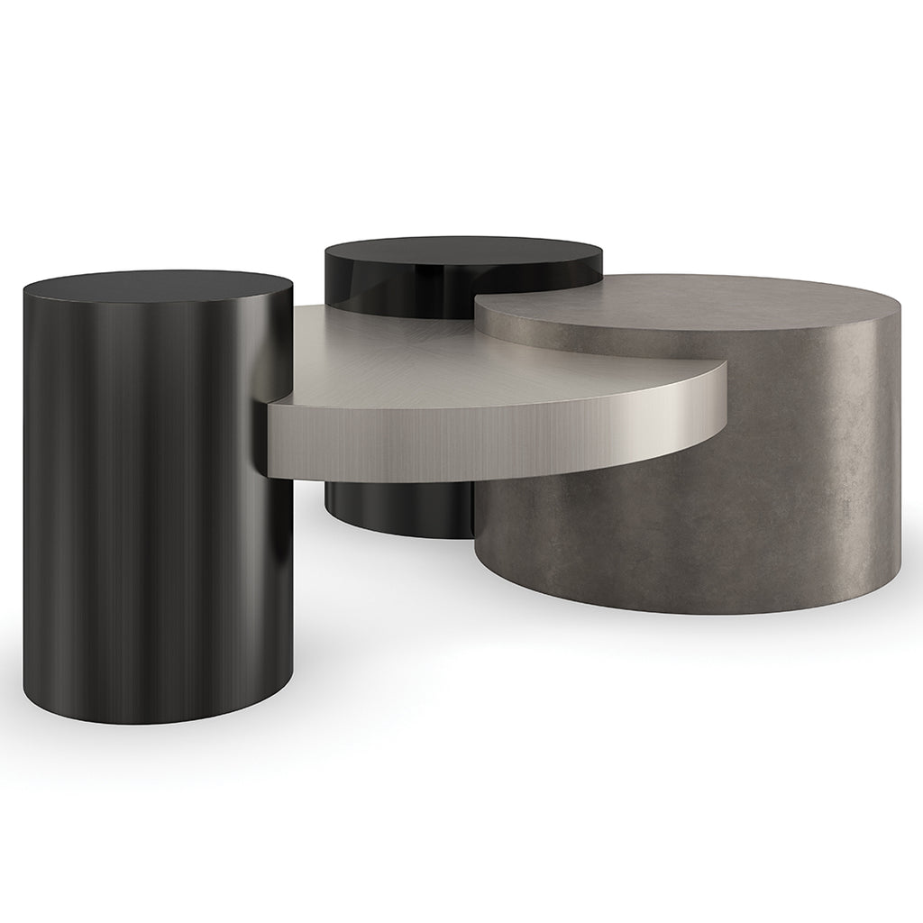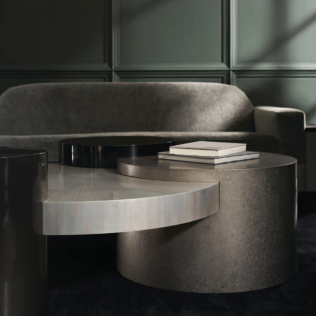 Form and function comes full circle with this modern cocktail table, featuring a luxe mix of details, finishes, and materials. Shimmering metallics pair with Piano Black to elevate simple cylinder shapes, designed to orbit a larger disc that draws attention with an intricately pieced starburst pattern. Style with our Caracole Constellation end table for added depth and dimension, and to create a larger space for entertaining and display.