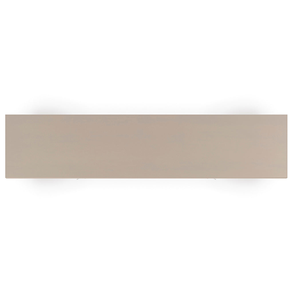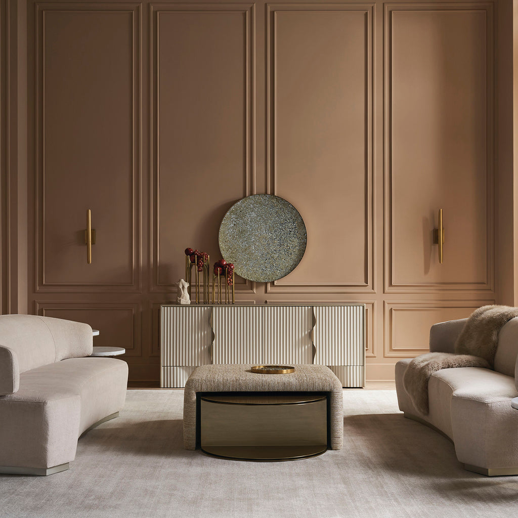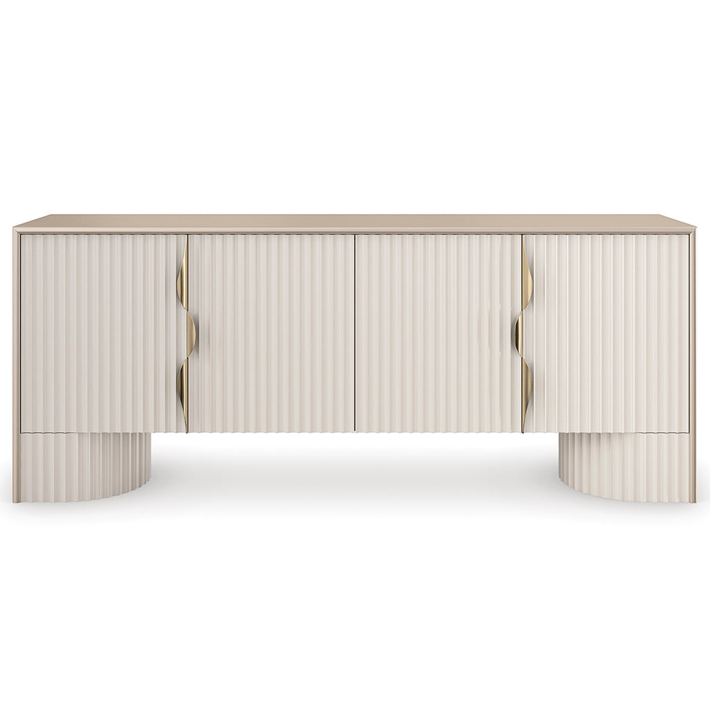 Inspired by the classic architecture of a Corinthian-style column, this media console makes an ornate yet elegant statement in a soothing neutral hue. Features fluted door fronts, warmly complemented by metallic ribbon pulls and an ample top in a Sparkling Argent finish. Its spacious interior offers open storage and two finger-pull drawers. Cutouts in the back allow for wire management.