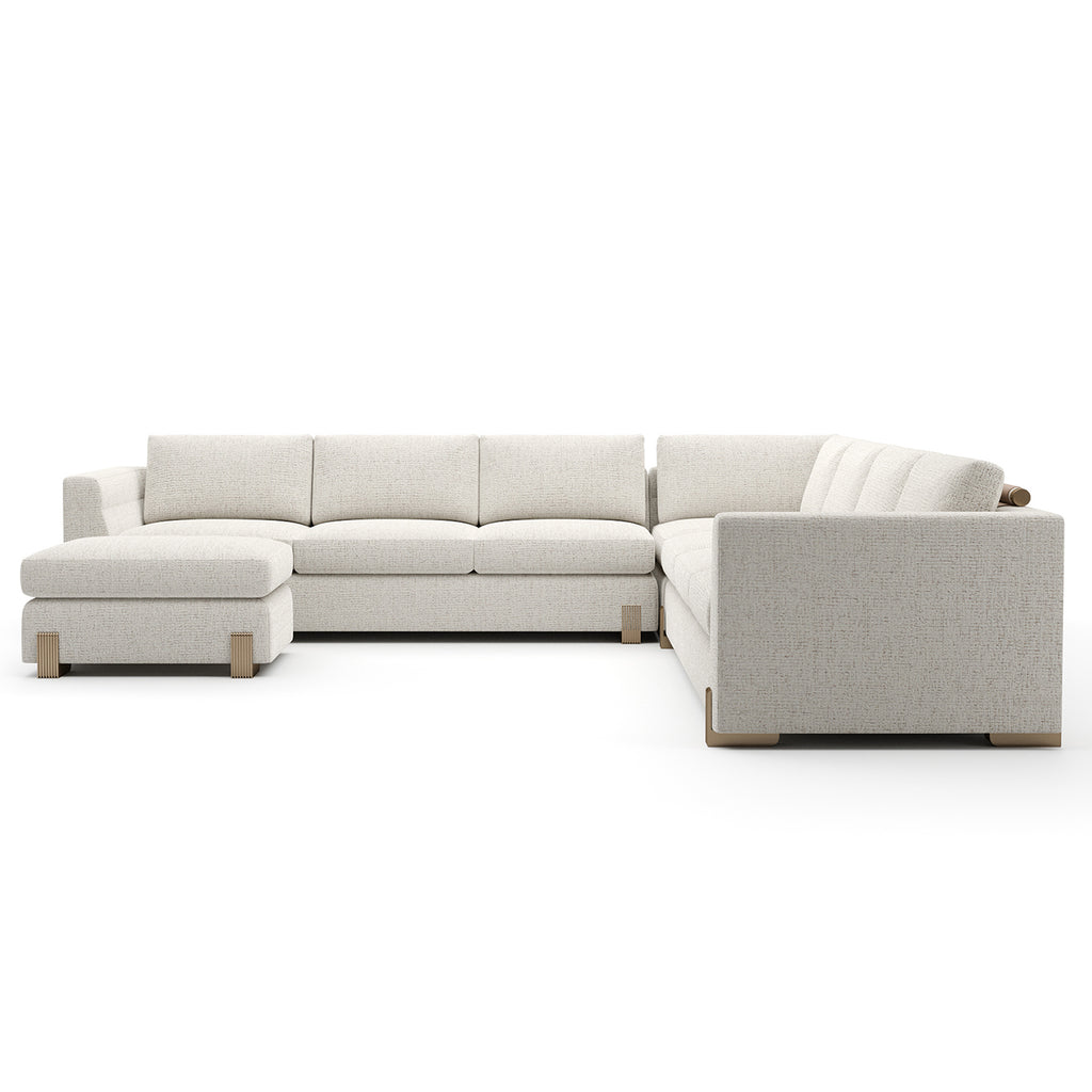The Counter Balance L Sectional in Birch offers a perfect harmony of modern elegance and subtle comfort. With refined oatmeal melange woven fabric with subtle rust threading and sleek Brushed Gold legs, this sectional adds a chic sophistication to any space.