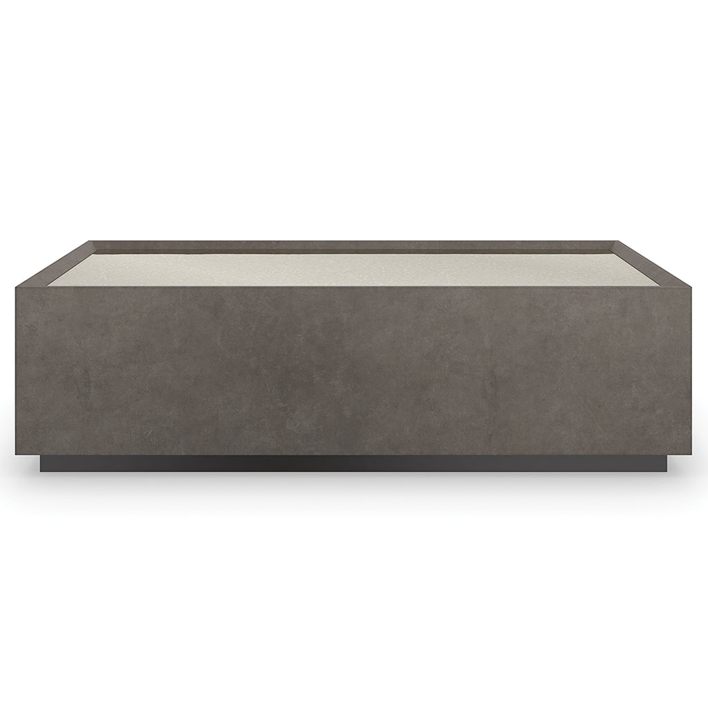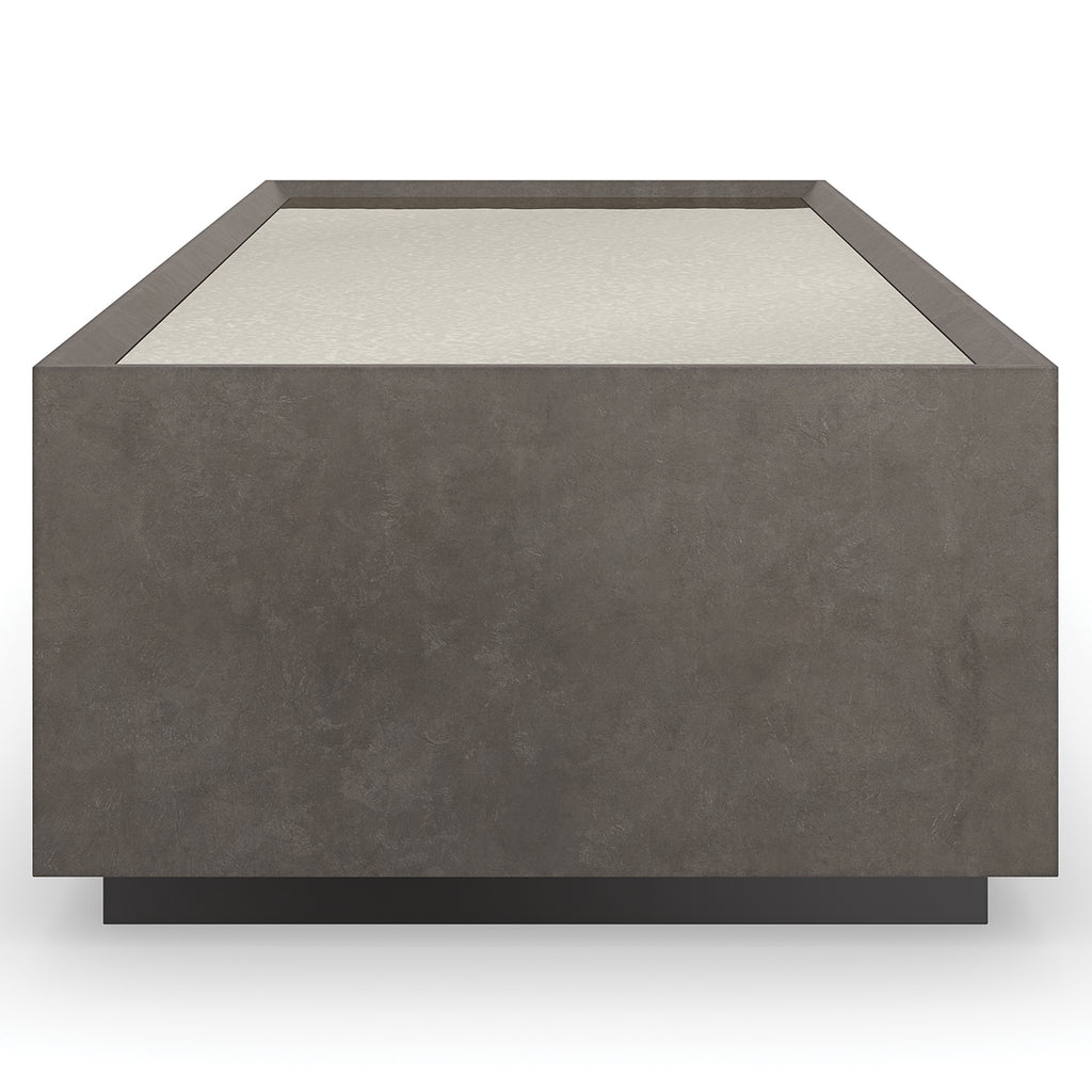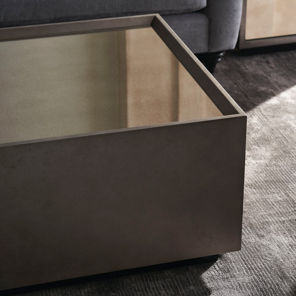 A designer go-to, this simple yet refined cocktail table adds depth and warm reflection in an alluring mix of materials and finishes. The same size and scale as our beloved Cocktail Couture table, it features a recessed antique mirrored top and overall broken leaf finish in Twilight Frost. A fade-away, Almost Black plinth base gives it a floating appearance. Style with a pair of our Caracole Dark Matter end tables to create a seating space with infinite shimmer and design potential.