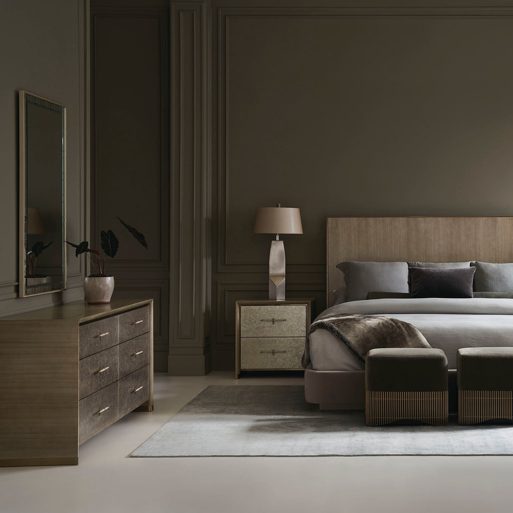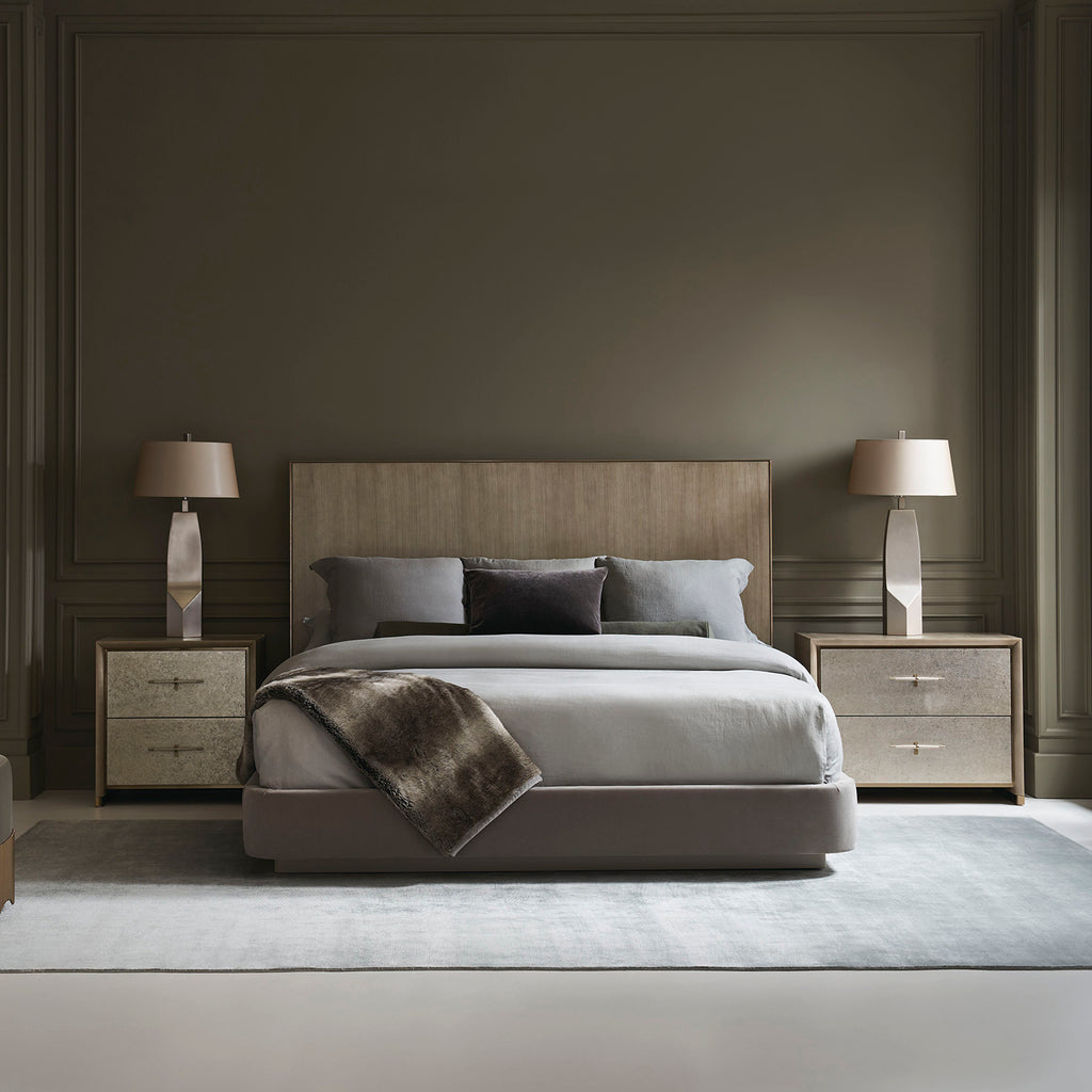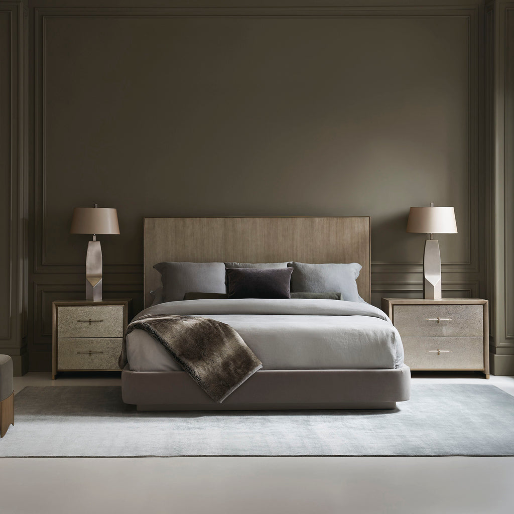 Rich in material, yet restrained in form, the Caracole Dream Chaser bed lends an understated balance of opulence and simplicity. A Dry Martini finish draws attention to its parsons-shaped headboard, crafted from exquisite Koto veneers and encased in Brushed Gold. Dressed in a pale gray mohair fabric, a footboard and side rails with gently rounded corners appear to float on a Cloud-painted plinth base. Also available with curved, wood-paneled wings for a more commanding presence.