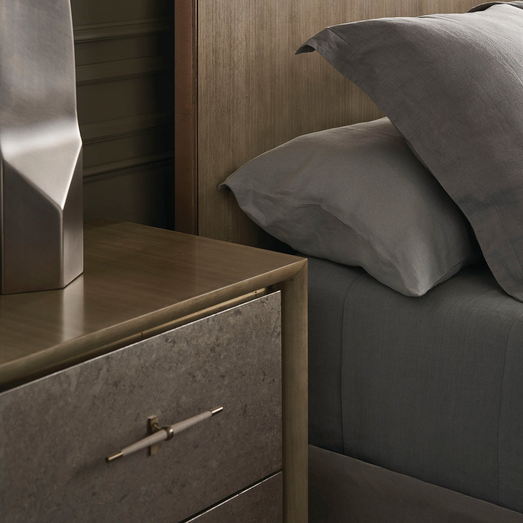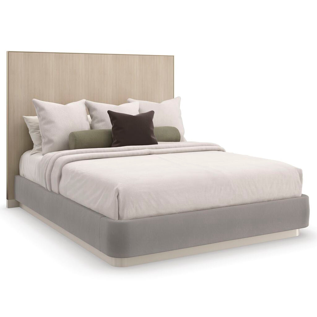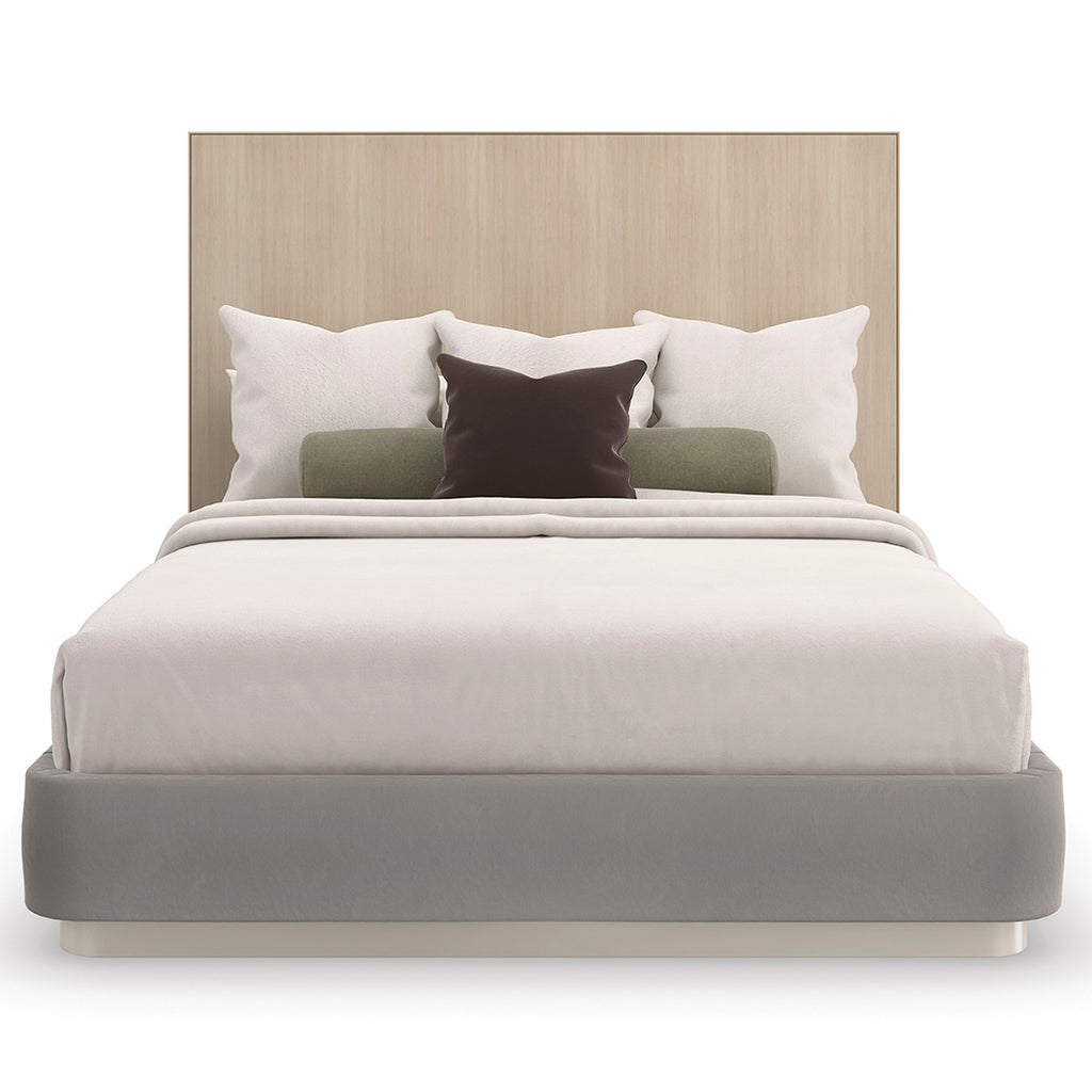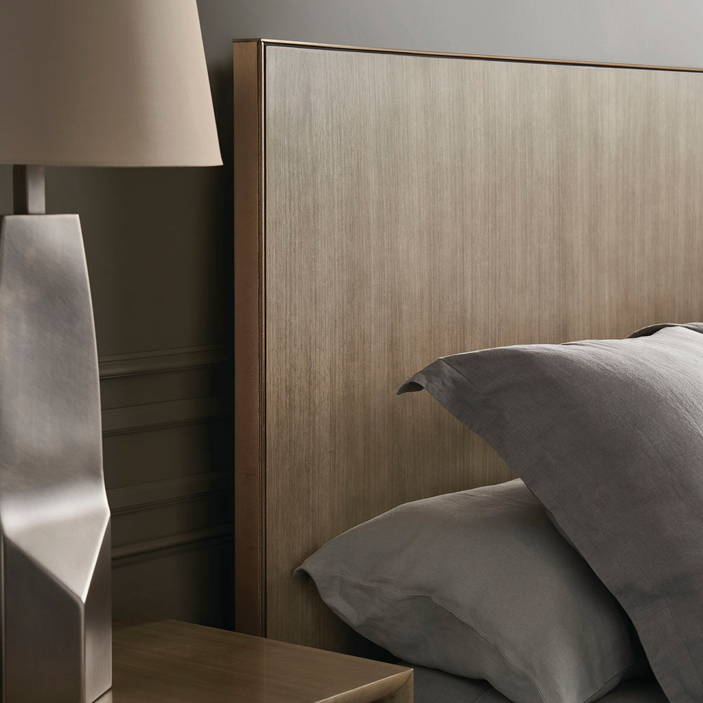 Rich in material, yet restrained in form, the Caracole Dream Chaser bed lends an understated balance of opulence and simplicity. A Dry Martini finish draws attention to its parsons-shaped headboard, crafted from exquisite Koto veneers and encased in Brushed Gold. Dressed in a pale gray mohair fabric, a footboard and side rails with gently rounded corners appear to float on a Cloud-painted plinth base. Also available with curved, wood-paneled wings for a more commanding presence.