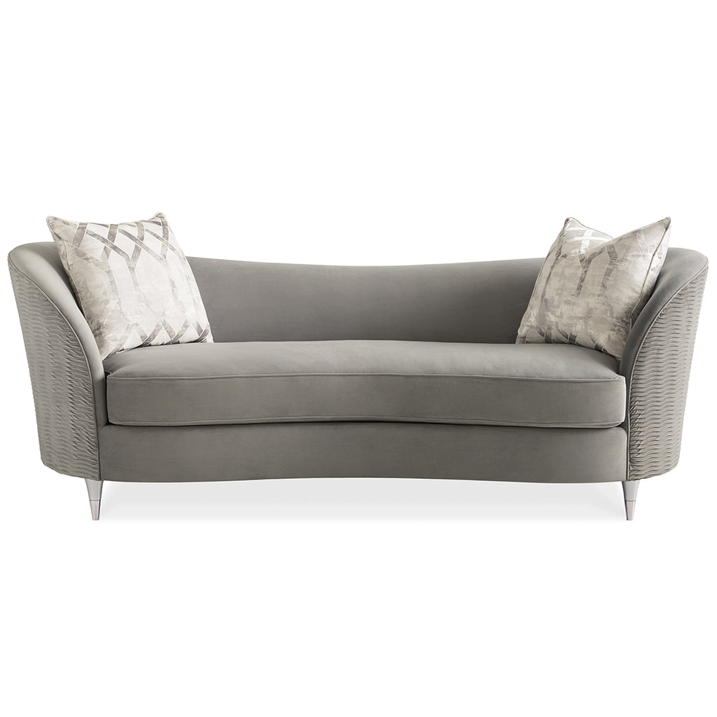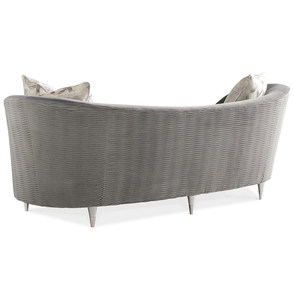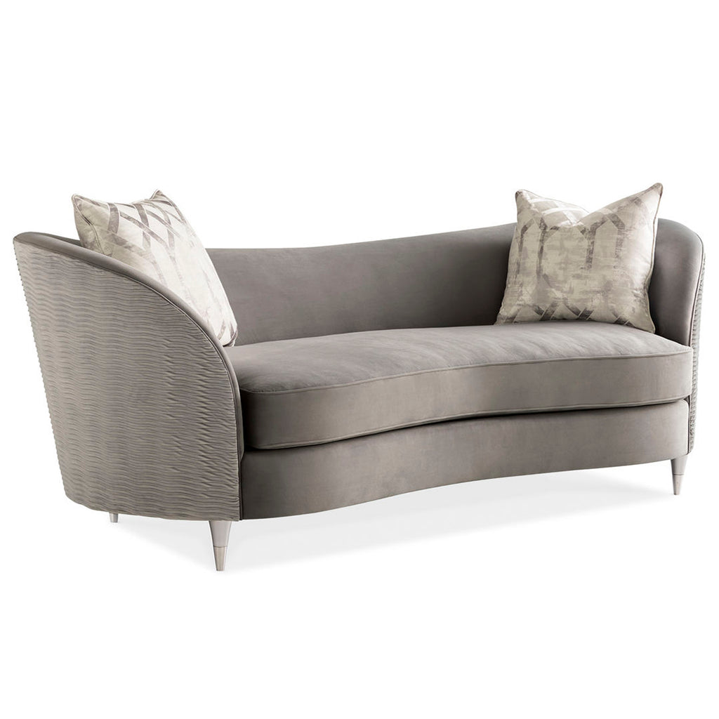 With its classic kidney shape, this sofa adds a soft silhouette to modern seating areas. Features a gently bowed bench seat and comfortably curved back, dramatically defined by pleated velvet that wraps the frame with a rippling effect. Artfully accented by metallic pillows and tapered round legs with polished ferrules.