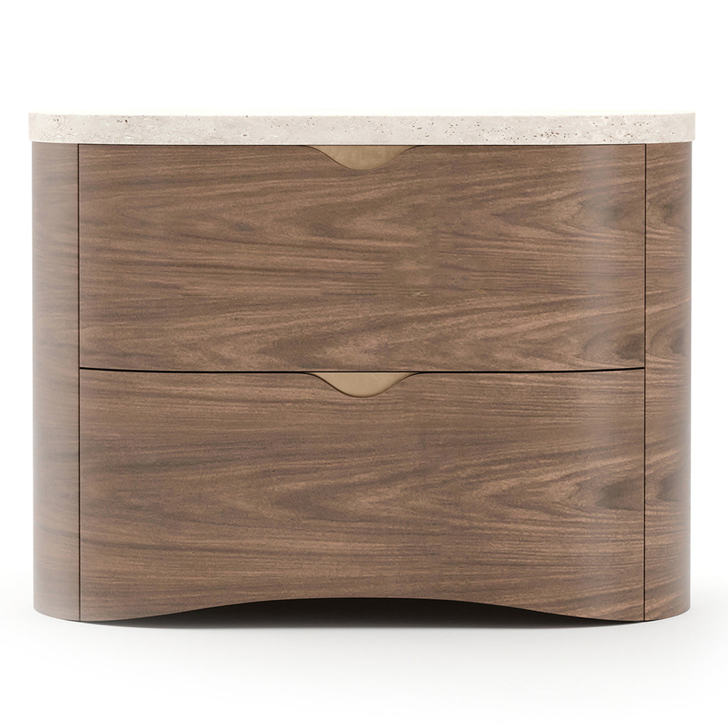 Grace your bedroom with the luxurious Fleur Large Nightstand. Crowned by an exquisite unfilled Travertine stone top, this elegant nightstand features a Porcini-finished case and two thoughtfully designed drawers with UV Snow interiors. Detailed with stylish hardware accented by a sophisticated Brushed Gold metal backplate, each unique natural stone surface ensures this piece will be an exceptional, one-of-a-kind addition to your home.