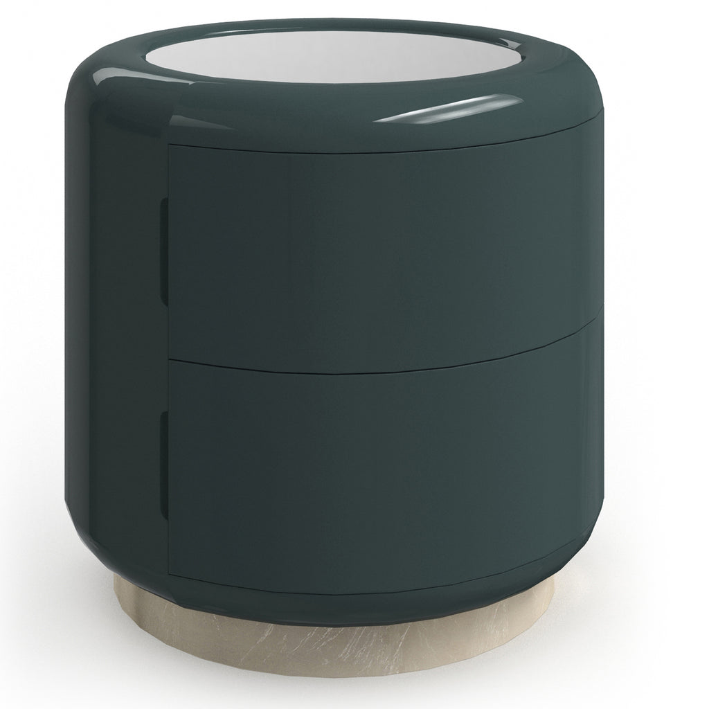 This piece adds a strong pop of glossy color to any room. The table’s barrel shape exudes post-modern Italian aesthetics with its generously rounded edges and compound curves that create a dramatic waterfall effect. Its Apatite Gloss or Caramello Gloss finish and shimmering Oracle or Chocolate Truffle. leaf base surround the piece. The top has a Crystal Grey or Smoked Bronze mirror. Two drawers open with embedded finger pulls and use soft-close mounts. The drawers’ interiors are painted to match.
