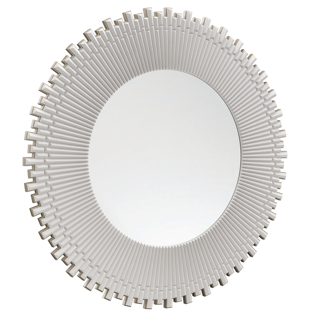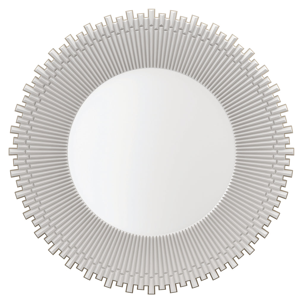 Named for the Greek god and personification of the Sun, this circular mirror radiates with triangular-shaped rays in a creamy Almond Milk finish. Intricately crafted with a crenulated detail around the edges, it adds depth and dimension to moments of reflection. Well-scaled to hang above a dresser or credenza to make a dazzling entrance.