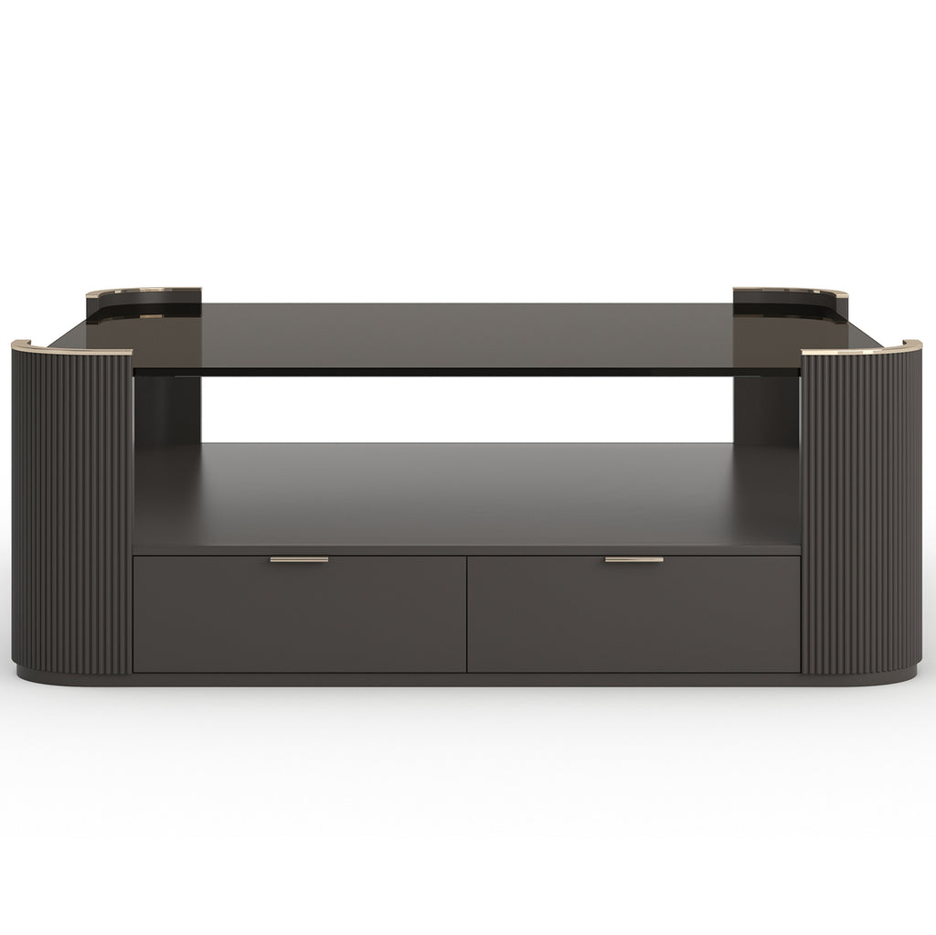 A square cocktail offers the most design flexibility in a room and this piece is no exception. It easily groups with other chairs and tables in a room. This piece has a clear glass top and half-moon fluted casework at each rounded corner in Matte Pearl, Oracle or Dark Chocolate . There is an open storage area for magazines, two drawers at the bottom, Caracole-stamped Whisper of Gold metal tab pulls and soft-close under mounts. The drawer interiors are finished to match.