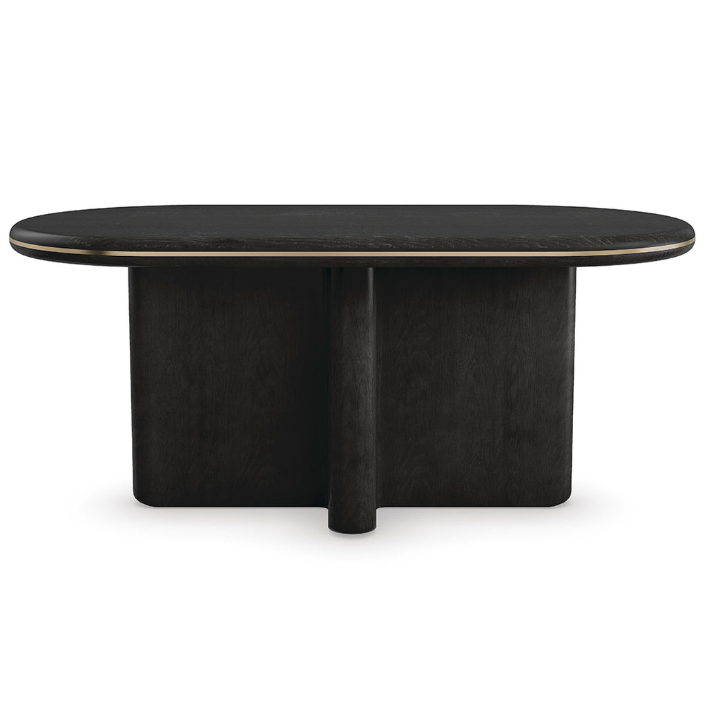 Minimal and elegant in a sophisticated mix of materials, Caracole Monty Dining Table brings a touch of drama to dining interiors. This timeless centerpiece is meticulously crafted from oak veneers and a moody Basalt finish to punctuate figured wood grains. Artfully embellished with a slender band of metal in Polished French Gold for a note of luxe and warm finishing touch.