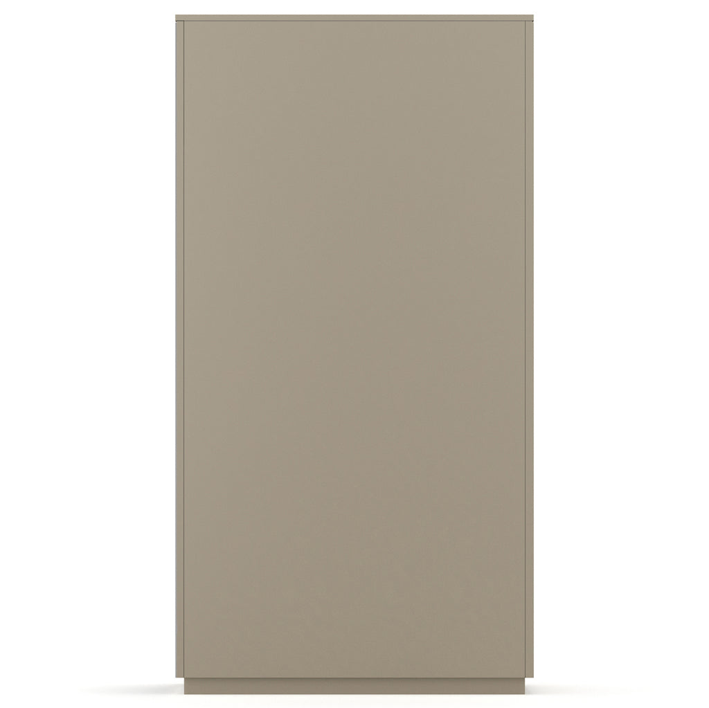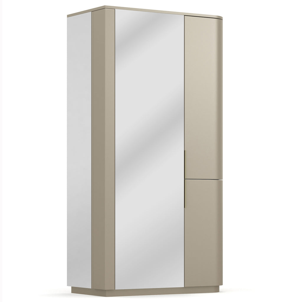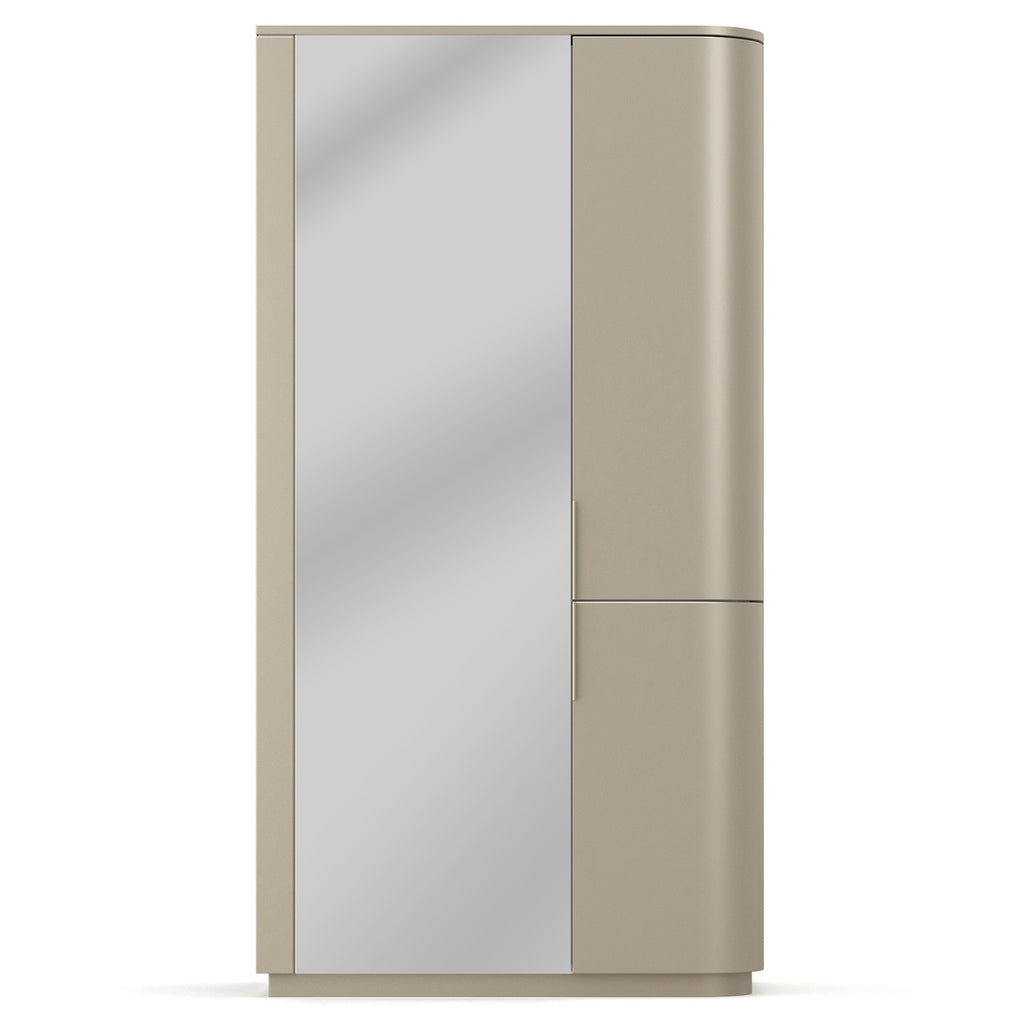 This distinguished piece offers so many versatile features that it can function as a full valet, a bar or even a stowaway media cabinet. Large panels of mixed materials and finishes create a subtle color-blocking effect. The wood cabinet is an elegant combination of strong right angles offset by generously filleted edges. The exterior finishes are luminous Soft Silver Paint Gloss paired with crystal clear mirrors that run full-length on the front and end panels. All the discrete metal pulls are finished in Brushed Whisper of Gold. A removable clothes rod and four adjustable shelves are on the left of the chest. There are two drawers with soft, under-mount guides. The interior on the top right of the cabinet has a mirrored back, three adjustable glass shelves and a motion sensor light. The lower right has three pull-out trays. The cabinet’s interior finish is Soft Silver Paint Gloss. Its slim plinth base is finished in Whisper of Gold.