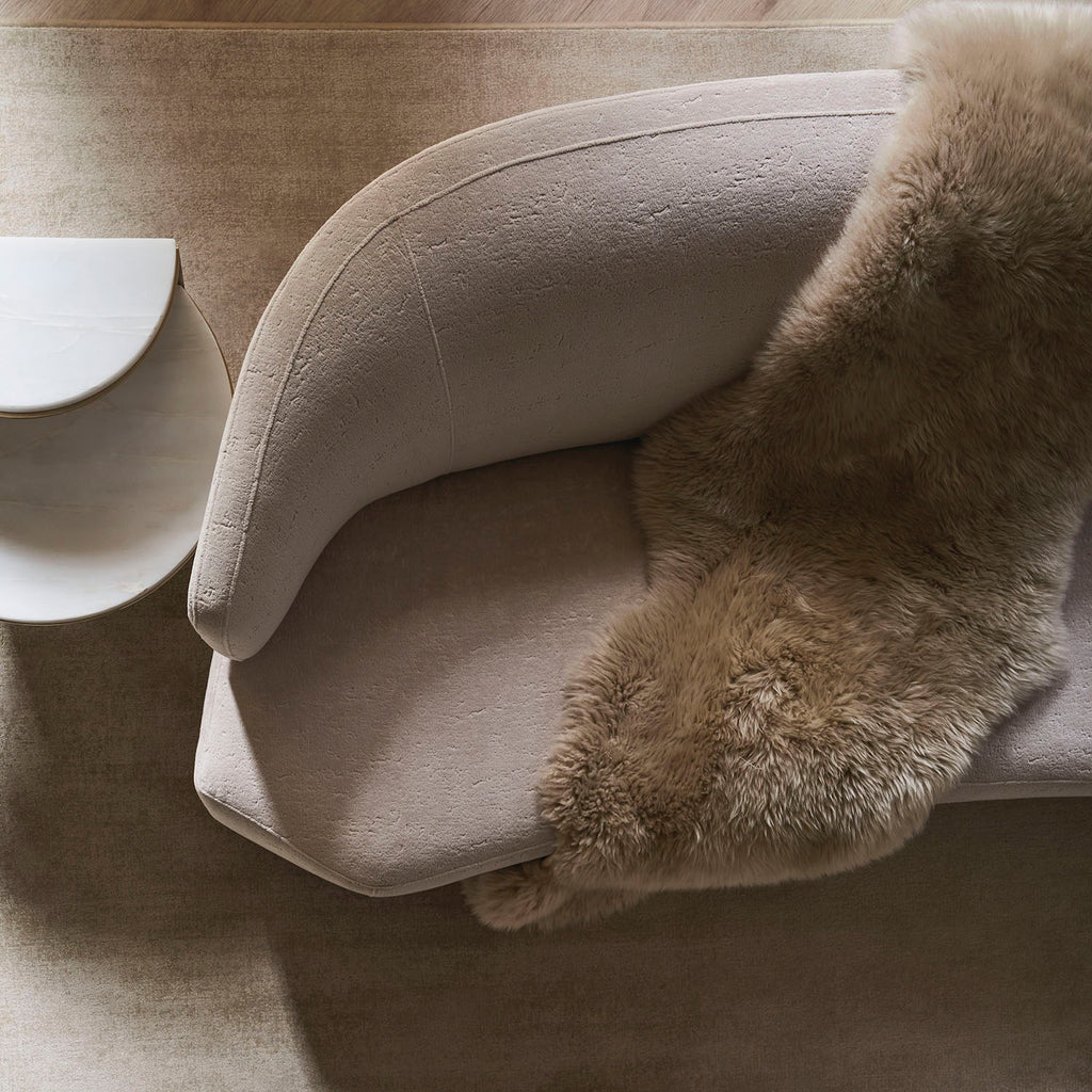 With a Klismos-inspired shape, this simple yet striking sofa is defined by a long and low, curving back atop a tight bench seat with clean, clipped edges. Elevated by a Sparkling Argent-finished, wood plinth base, its smooth silhouette in a distressed ivory velvet almost seems as if it’s carved from stone.