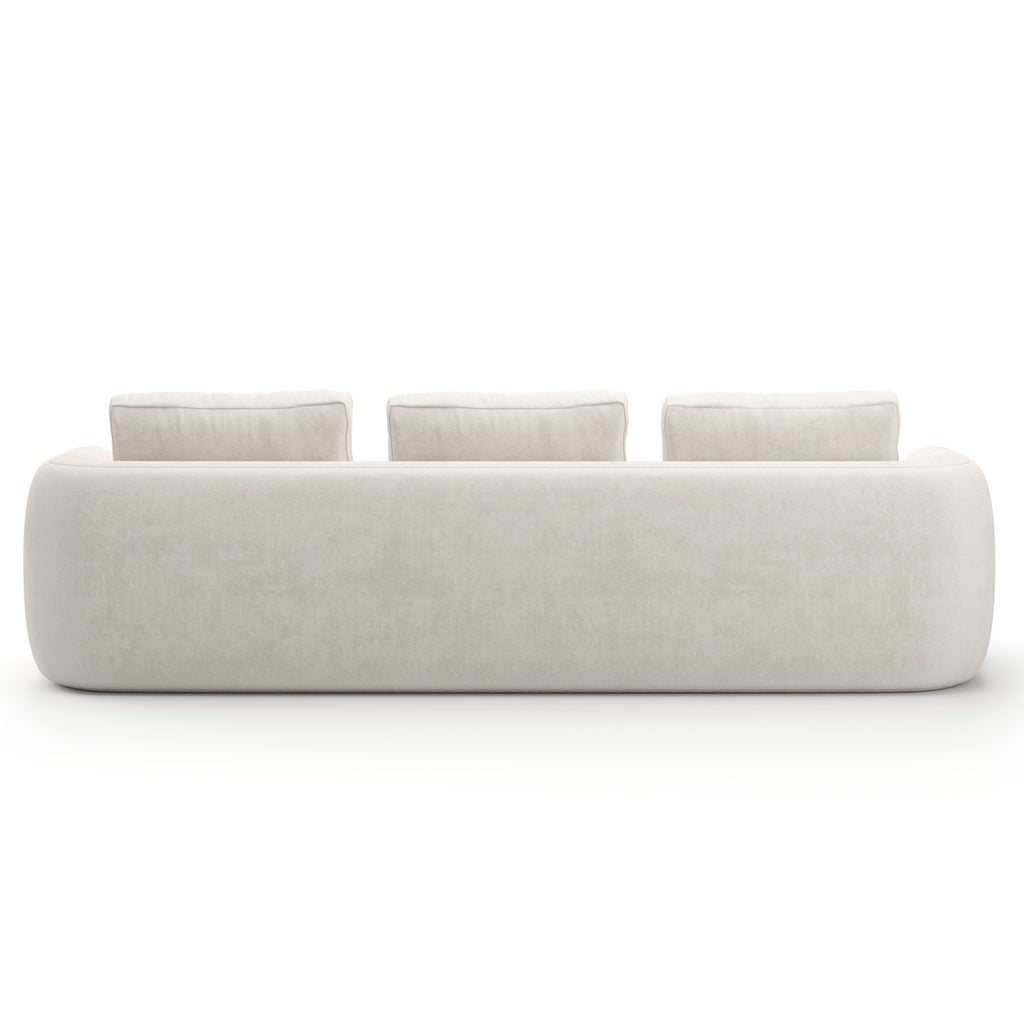Relax in sophisticated comfort with the Overlap Sofa Ecru. Its luxurious, fully upholstered design in ecru linen sits gracefully atop an unfilled Travertine stone base, each piece uniquely detailed by nature's artistry, providing contemporary elegance and lasting comfort.