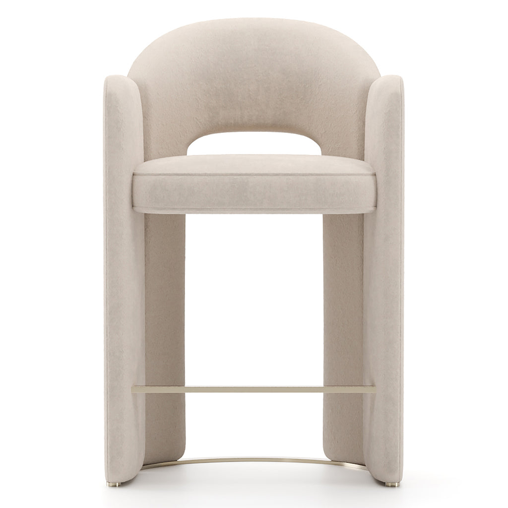 Upholstered in sumptuous Ivory vintage velvet and elegantly detailed with Whisper of Gold metal spline accents, the Overlap Counter Stool Ivory provides refined seating comfort and style for modern kitchen and dining counters..