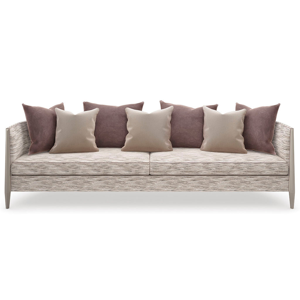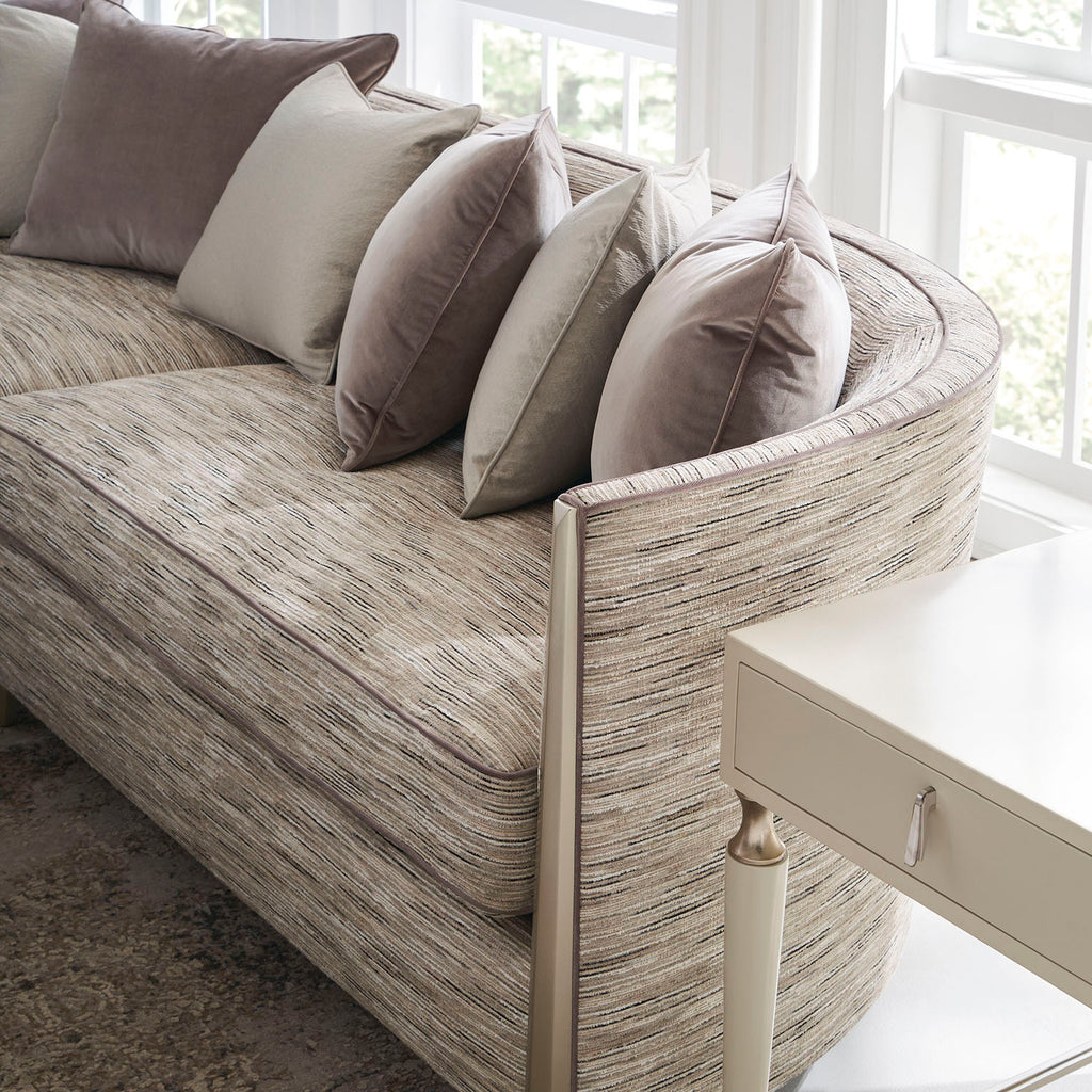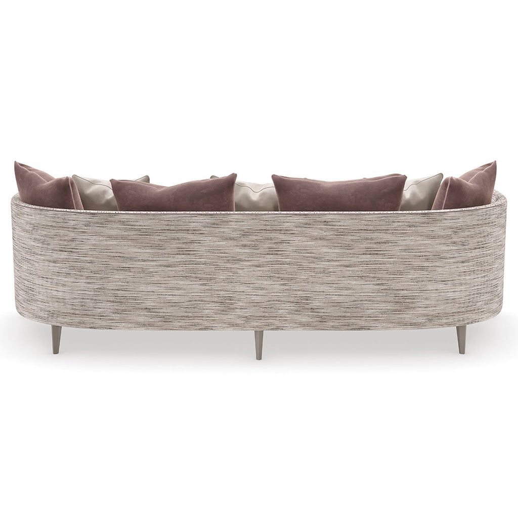 Add instant sophistication to a room with the chic glamour of this statement sofa. Boasting an elegantly curved form that ensconces you in style, its character is charmingly balanced from every angle. A single, no-sag seat cushion extends its clean lines while an expertly tailored contrasting welt defines its well-chosen curves. The mélange of exquisite accent pillows in subtle coordinating shades adds another layer of luxe while a Silver Shadow finish accentuates the beauty of the sofa’s sides and fluted legs.