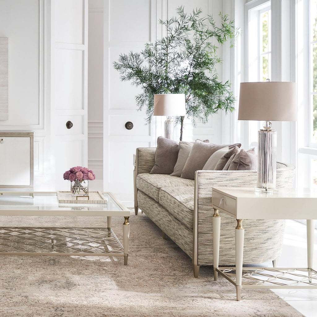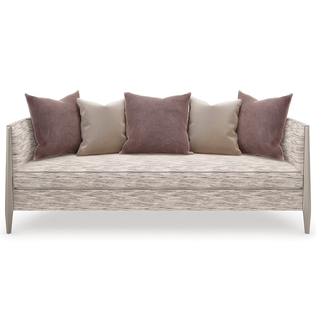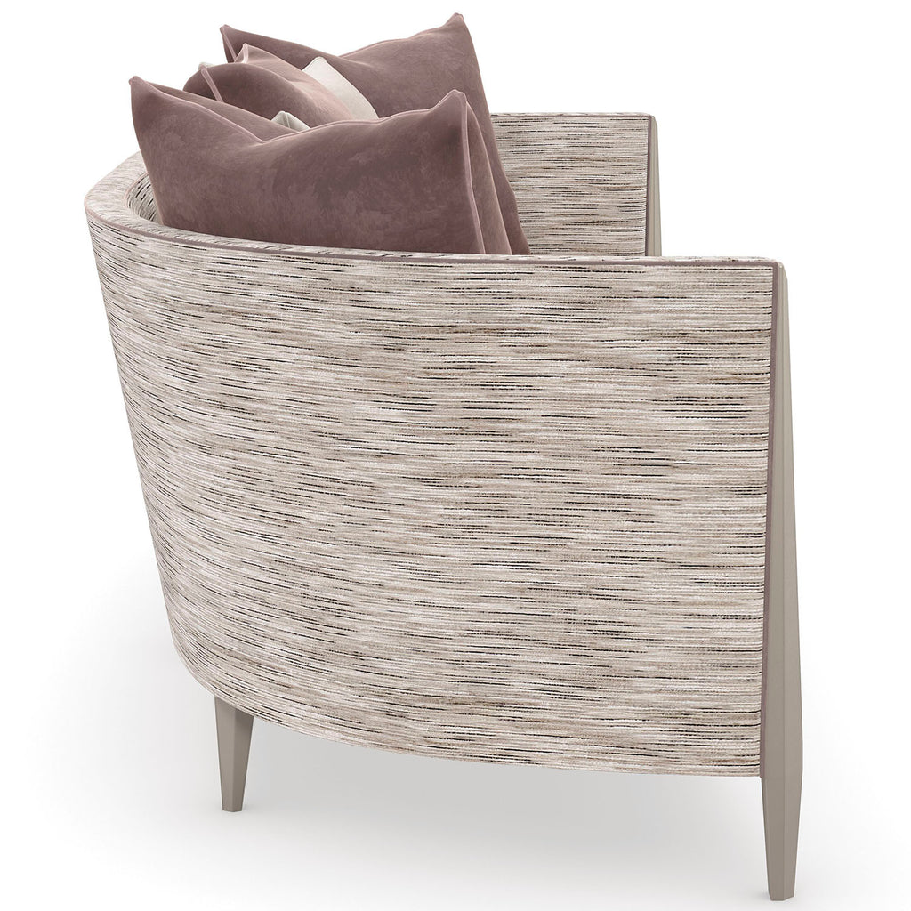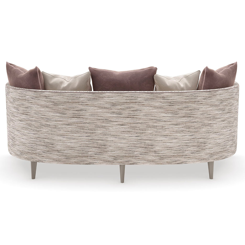 Add instant sophistication to a room with the chic glamour of this statement sofa. Boasting an elegantly curved form that ensconces you in style, its character is charmingly balanced from every angle. A single, no-sag seat cushion extends its clean lines while an expertly tailored contrasting welt defines its well-chosen curves. The mélange of exquisite accent pillows in subtle coordinating shades adds another layer of luxe while a Silver Shadow finish accentuates the beauty of the sofa’s sides and fluted legs.