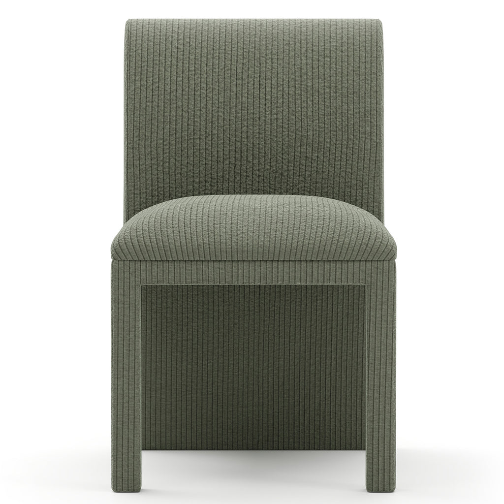 Add a refreshing note of sophistication to your dining room with the Pinstripe Upholstered Dining Chair in Eucalyptus wide corduroy velvet. Fully upholstered and finely crafted, this chair exudes calm, inviting luxury..