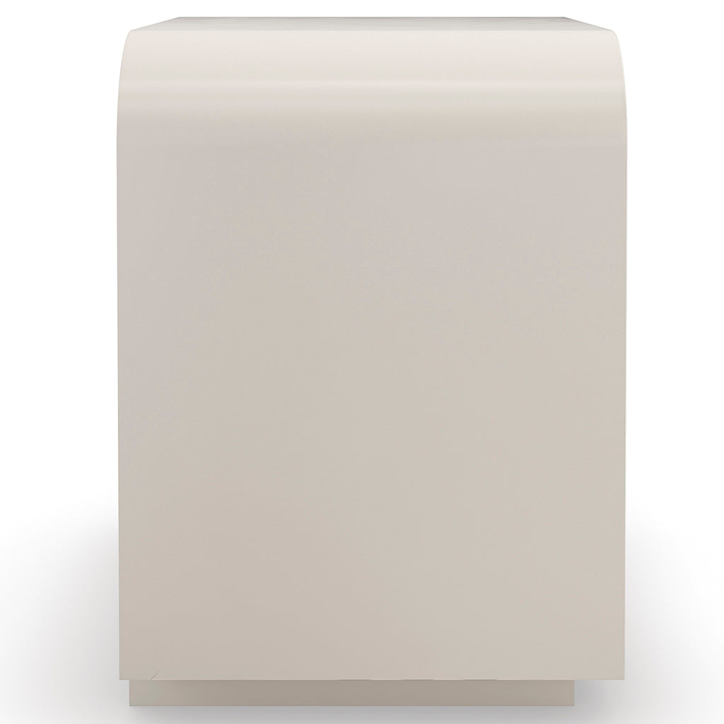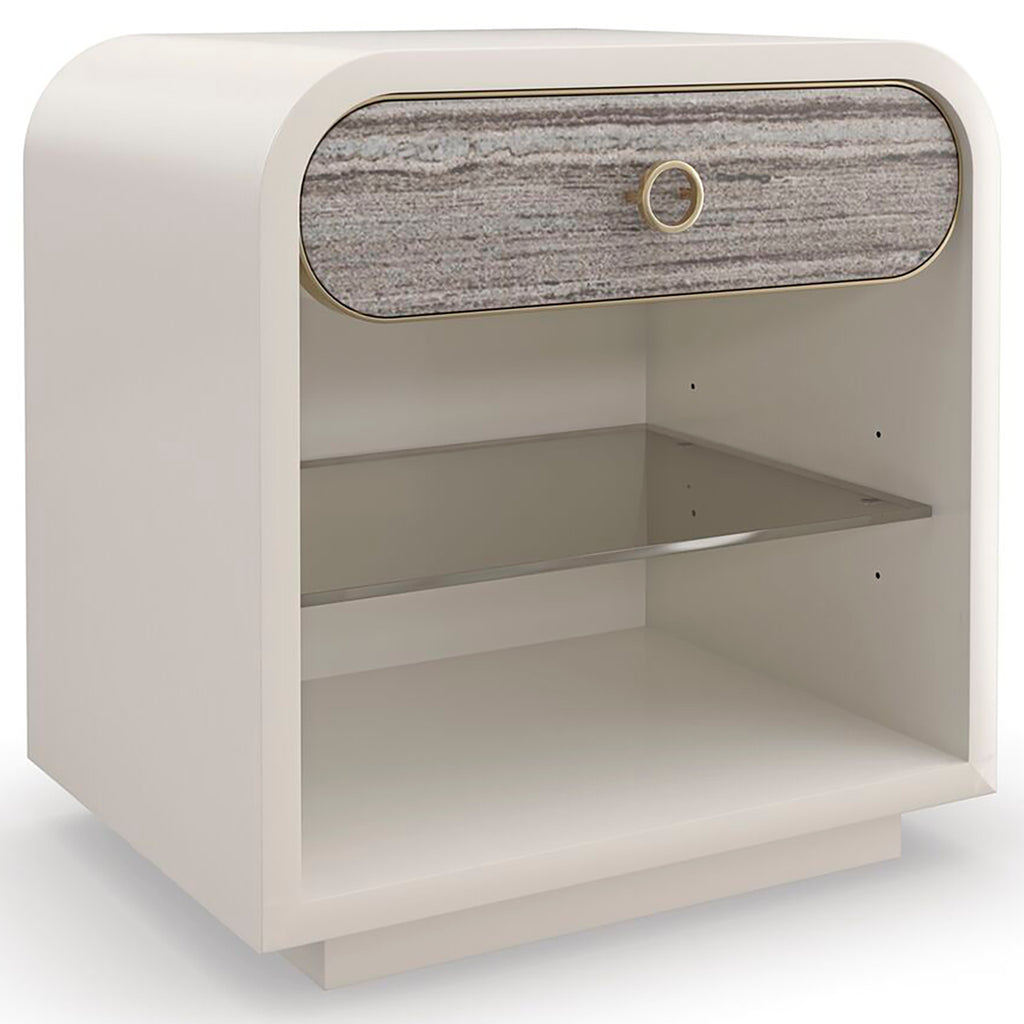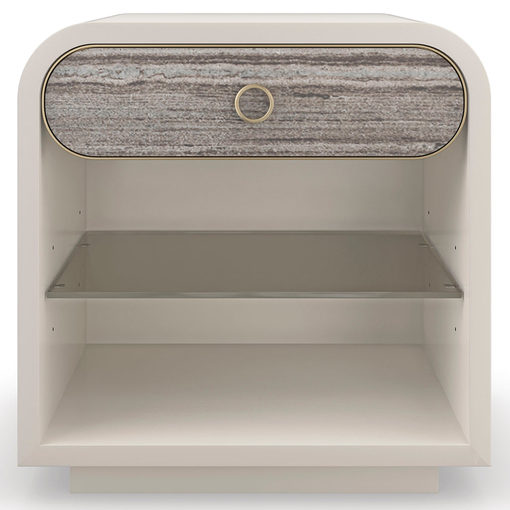 Fundamental in form and function, Caracole Quarry Nightstand draws attention with its compelling mix of texture and material. Features a single drawer, crafted from polished gray sandstone framed in metal and minimally adorned by a small ring pull in Champagne Gold. Offers ample open space with a smoked bronze glass shelf for keeping nighttime reads and decor. An Almond Milk finish adds soft contrast in a creamy neutral hue.