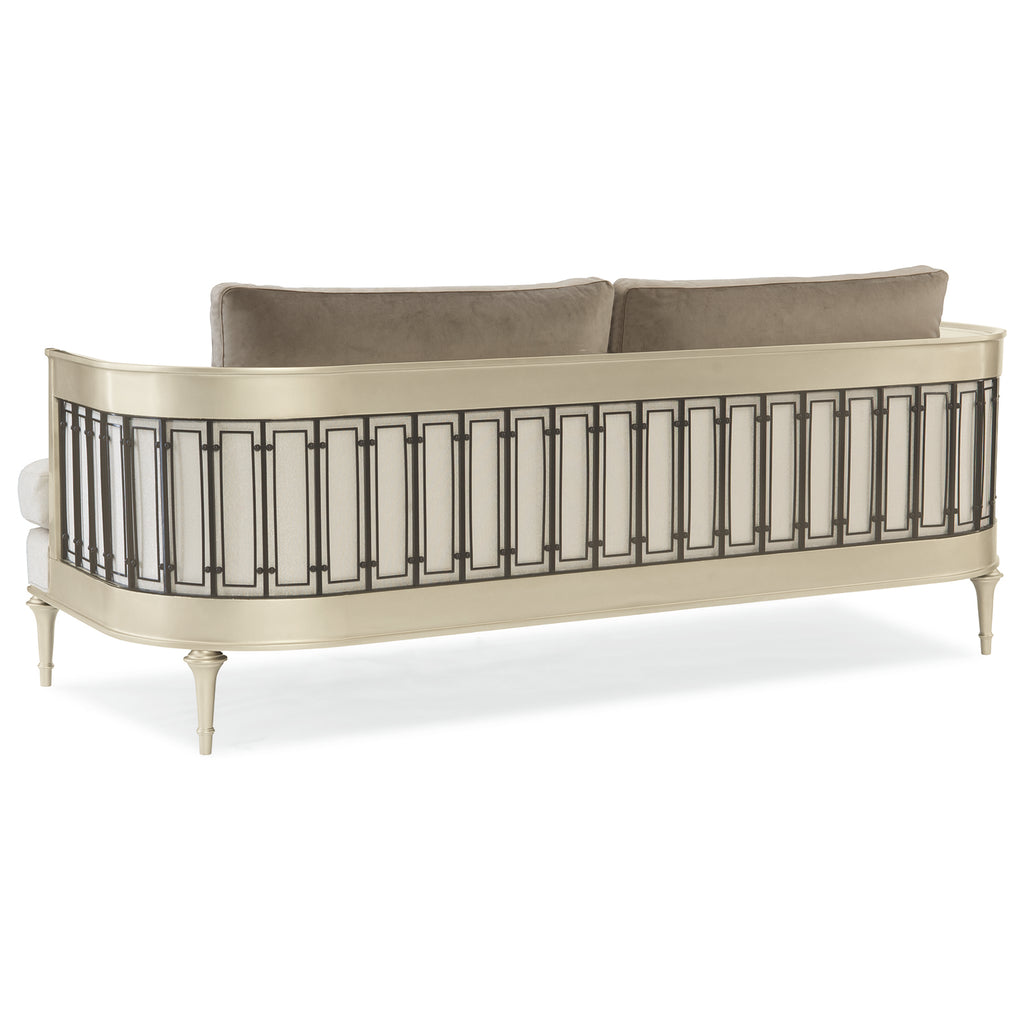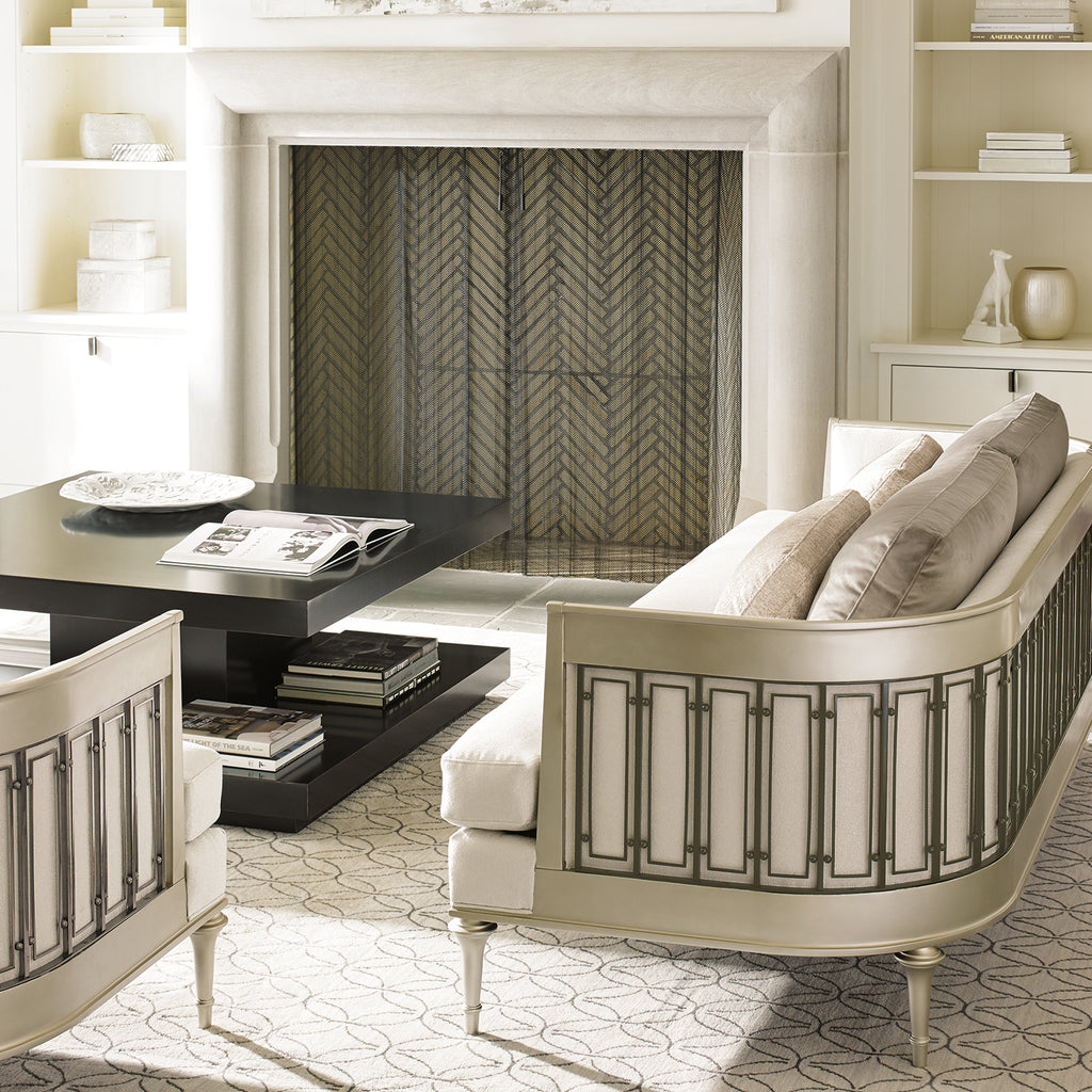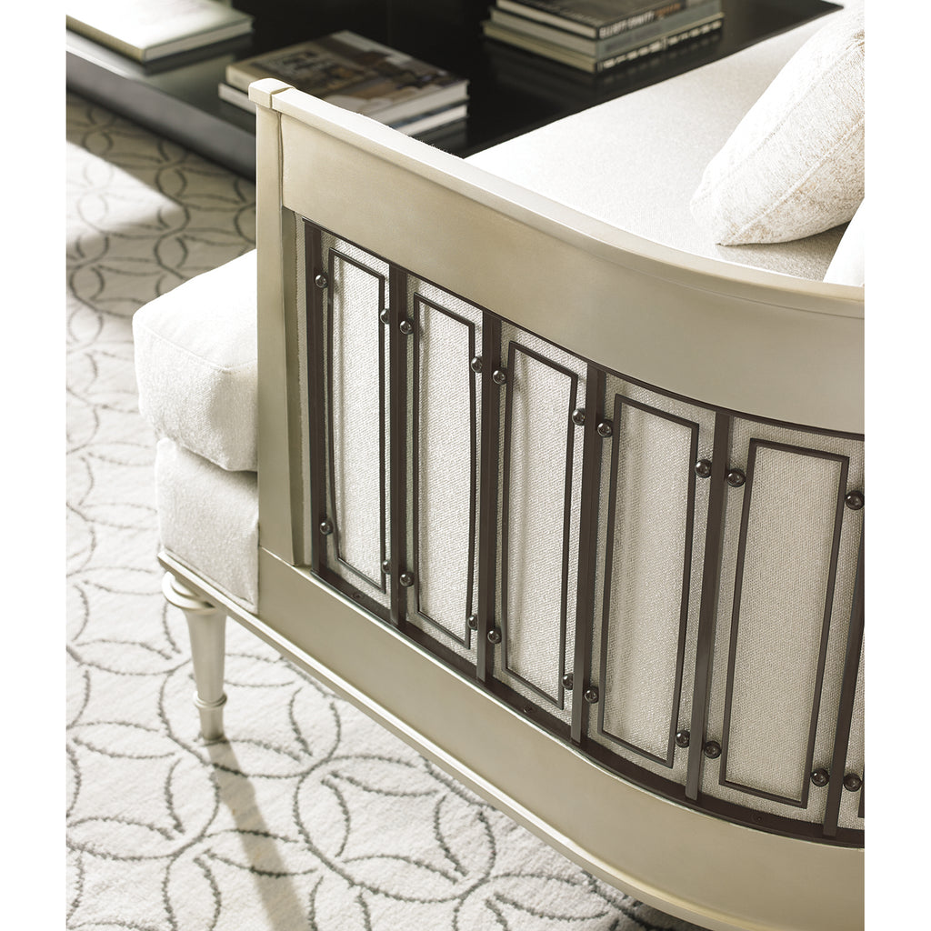 Crisp and clean, this stylish sofa offers a fashion-forward mix of materials that are distinctly Caracole. A stunning, wraparound detail in Tungsten metal was inspired by an iron gate we noted while traveling. A soothing menswear palette with suiting colors in grey and neutral and a sophisticated frame finished in Platinum give this inspiring silhouette a fresh, current look. Clad in a shimmery white boucle with boxed back cushions in a soft grey velvet and chic little bolsters that offer an interesting rough weave and a white, linear pattern that mimics winter mountaintops. This compelling silhouette’s 360 degrees worth of details make it distinctively suited for rooms with floating seating arrangements.