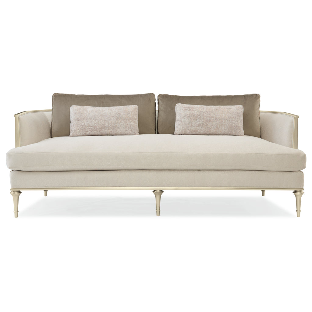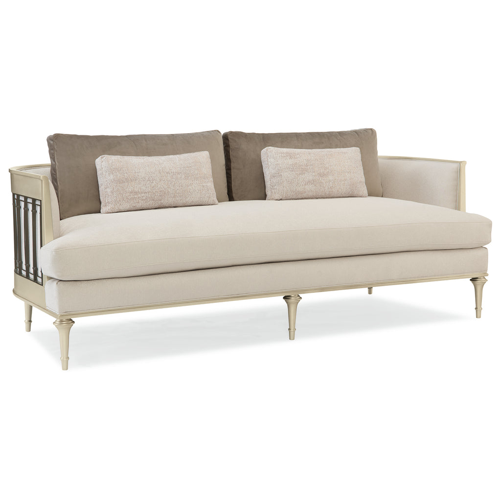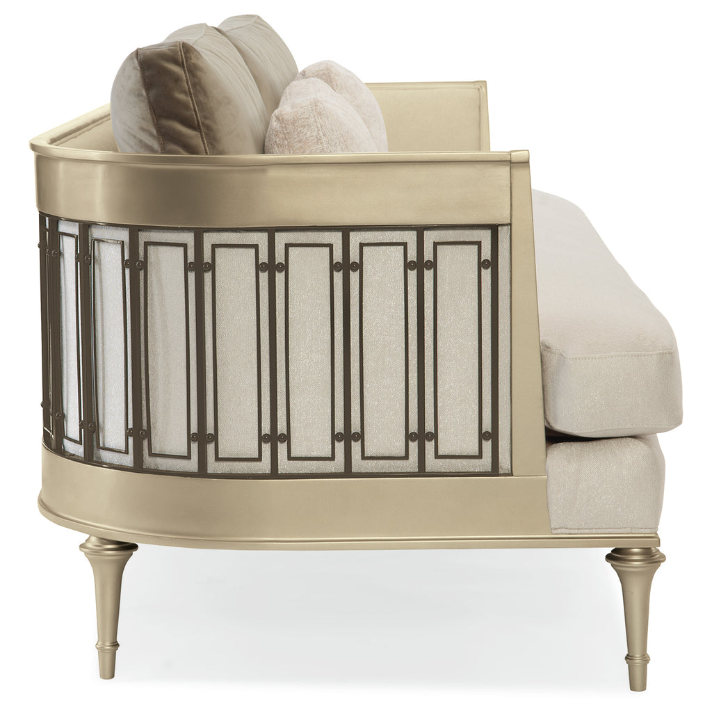 Crisp and clean, this stylish sofa offers a fashion-forward mix of materials that are distinctly Caracole. A stunning, wraparound detail in Tungsten metal was inspired by an iron gate we noted while traveling. A soothing menswear palette with suiting colors in grey and neutral and a sophisticated frame finished in Platinum give this inspiring silhouette a fresh, current look. Clad in a shimmery white boucle with boxed back cushions in a soft grey velvet and chic little bolsters that offer an interesting rough weave and a white, linear pattern that mimics winter mountaintops. This compelling silhouette’s 360 degrees worth of details make it distinctively suited for rooms with floating seating arrangements.