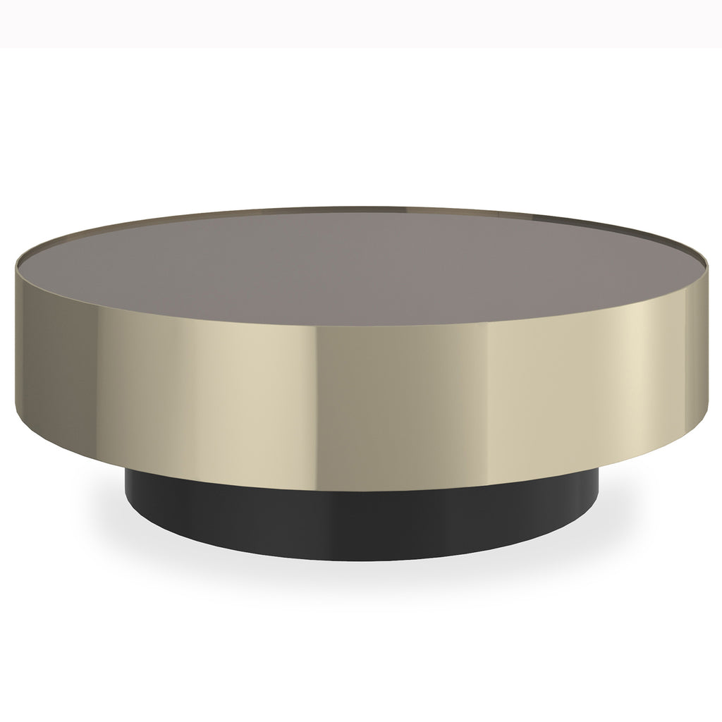 This round-in-round cocktail table takes you back to the glamour of Studio 54. Glossy and impressive, this large, round piece has a Smoked Bronze Mirror top, banded in mirror-polished Whisper of Gold metal. The short, thin base is mirror-polished in Dark Chocolate. For a punctuation of color, an optional Rouge Red Gloss round tray purchased separately can be removed from its top to carry appetizers and cocktails.