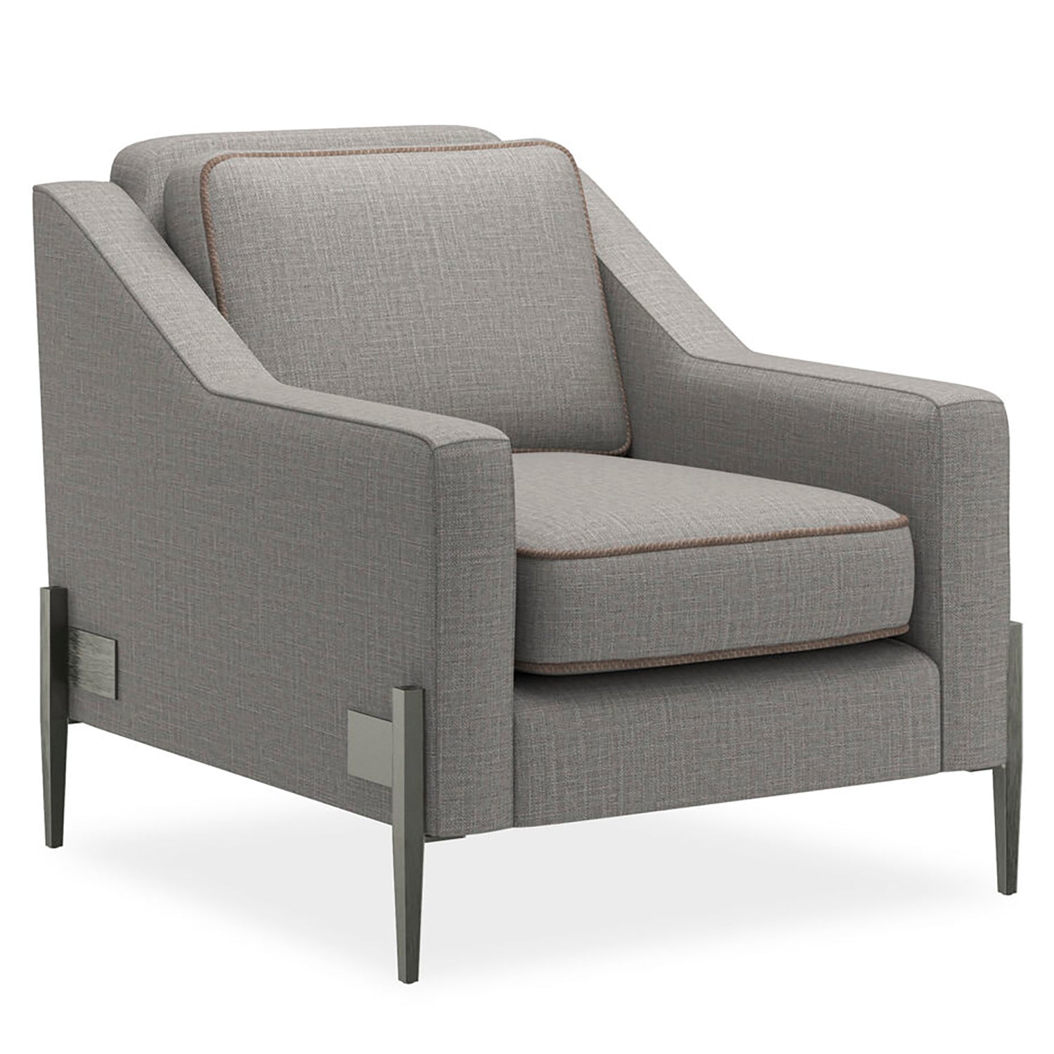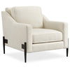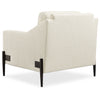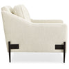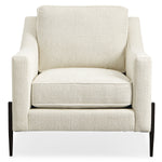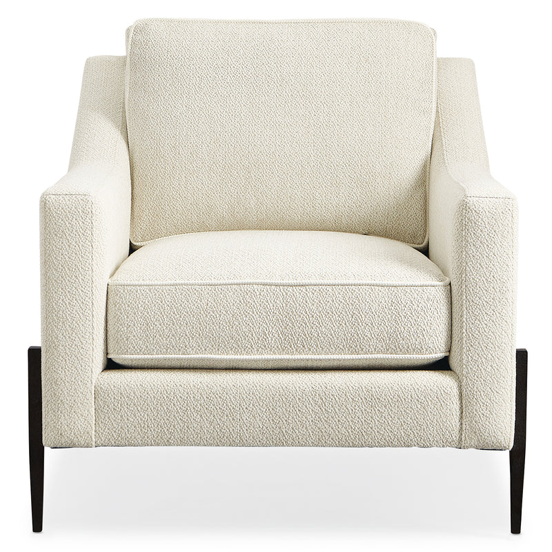 Modern meets classic in the perfect remix represented in this marvelous chair. Its timeless silhouette feels updated and relevant with a suspended frame, metal flange detailing and cast-metal tapered legs—all wearing a bold Black Iron finish. Its sumptuously comfortable seat is upholstered to perfection in a wooly, textured body fabric that feels as delightful as it looks. A woven leather decorative welt outlines the slope of this reimagined track-arm chair while lending an element of organic harmony.