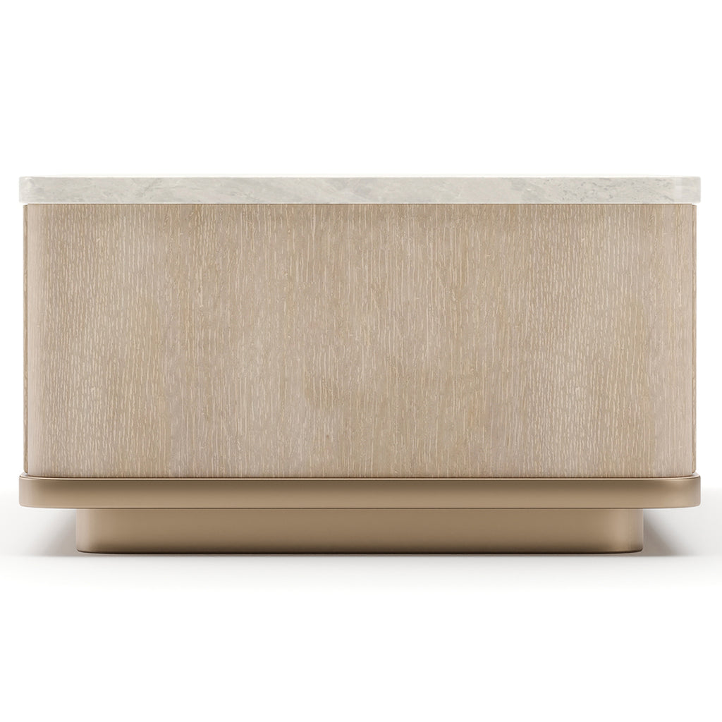 The Rhythm Rectangle Cocktail Table showcases a luxurious Travertine stone top, enhanced by Sun Drenched Oak finishes and reeded doors. Supported by a refined Neutral Metallic base, this table elegantly combines organic beauty with sophisticated craftsmanship.