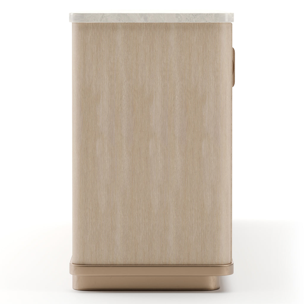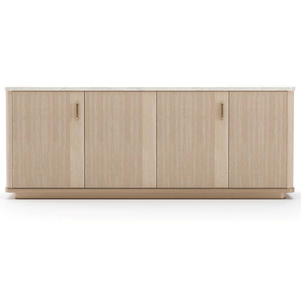 The Rhythm Sideboard includes a Travertine stone top, reeded Sun Drenched Oak doors, and a base finished in Neutral Metallic. The spacious interior offers open storage and drawers with UV Linen interiors, combining practical storage and refined detailing.