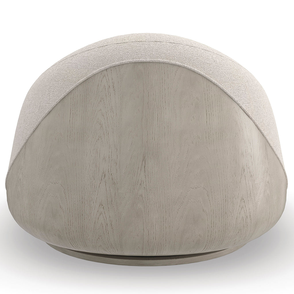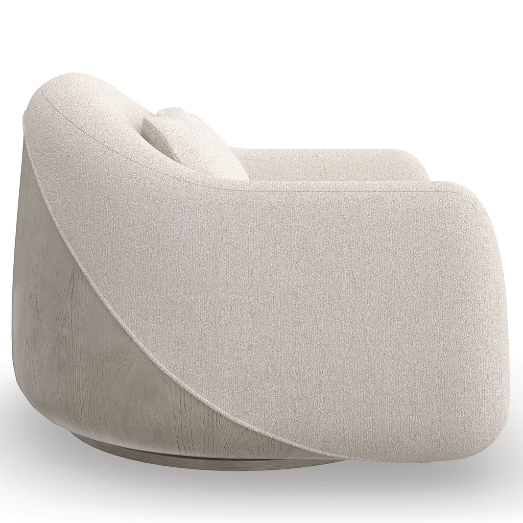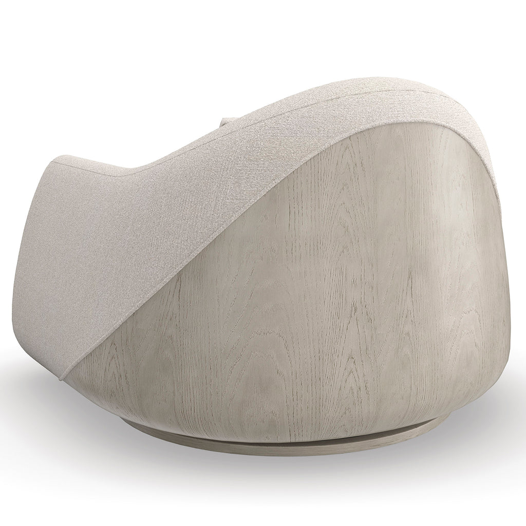 The embodiment of calm and continuity, Caracole Serenity Swivel Chair invites lounge-like comfort with its soft, sculptural shape. Infinitely inviting, its enveloping silhouette is tailored in a totally touchable ivory boucle fabric and encased in a Fossil-finished, faux wood shell. Features a recessed swivel base for a floating appearance and added momentum.