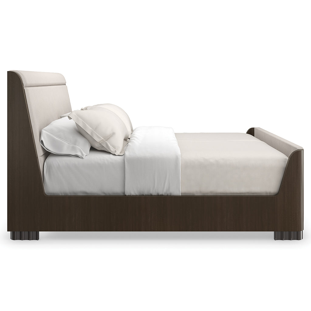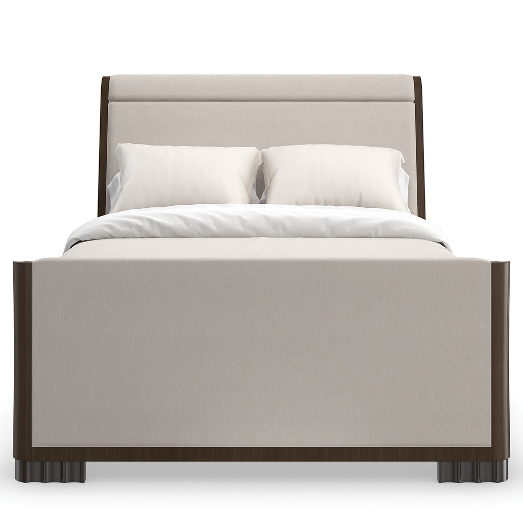 Inspired by neoclassical architecture, this contemporized sleigh bed features a comfortably canted headboard and clean-lined footboard, dressed in a faux slub silk that mimics microfluting found on other pieces in our collection. An Otter finish along the footboard and matching side rails adds warming contrast, punctuated by overscaled fluted legs in Dark Chocolate. Also available: fluted wing panels for a more commanding presence.
