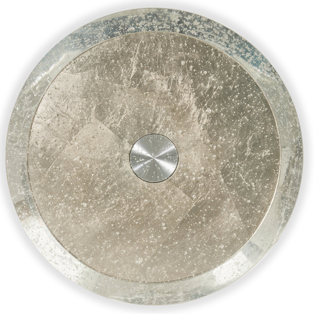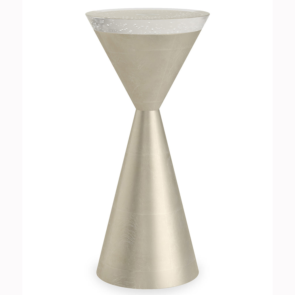 Bold and bubbly, this artful accent table delights the eye with its alluring design. A substantial, bevel-cut top in cast bubble glass adds sparkle to a reimagined, hourglass-shaped base, finished in a mix of shimmering silver leaf finishes. Captivating in form and function, it layers in light and a cool metallic, while offering the perfect place for a chilled cocktail and your favorite spy novel.