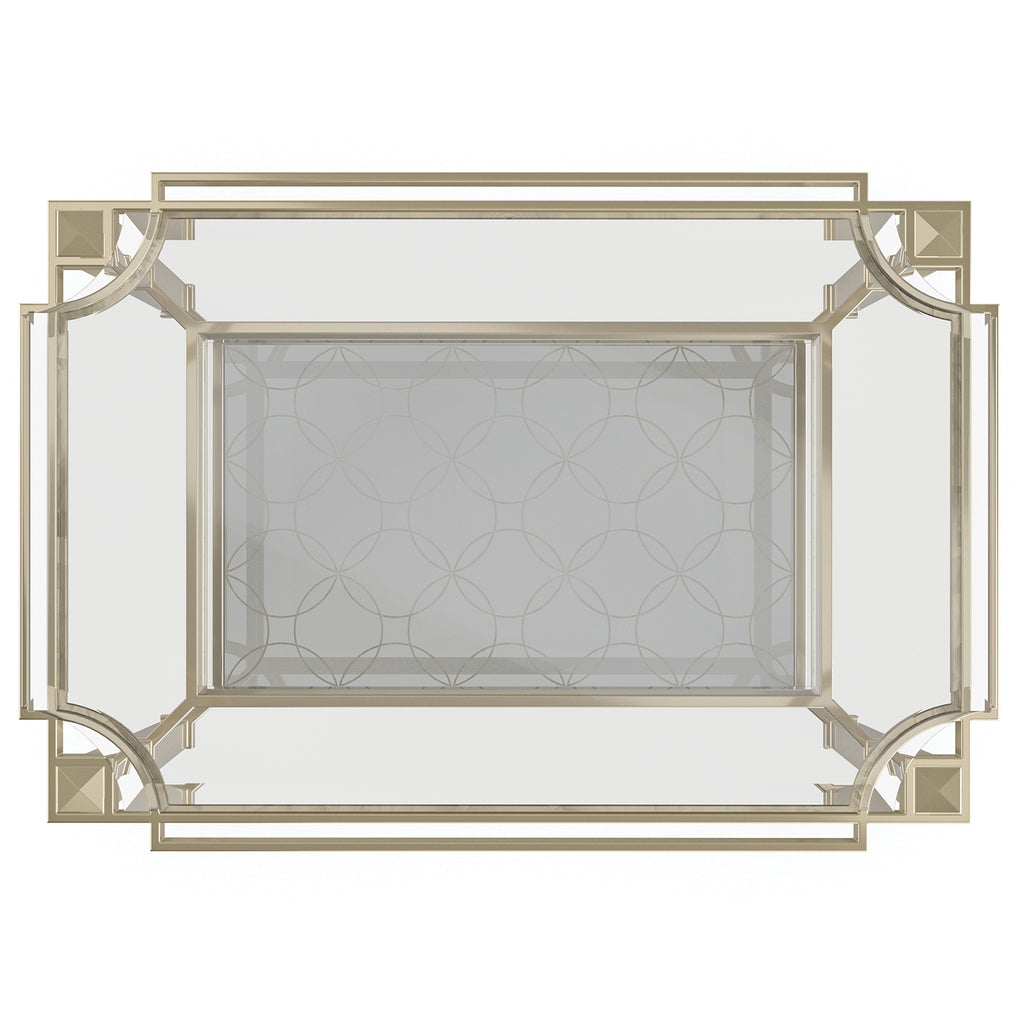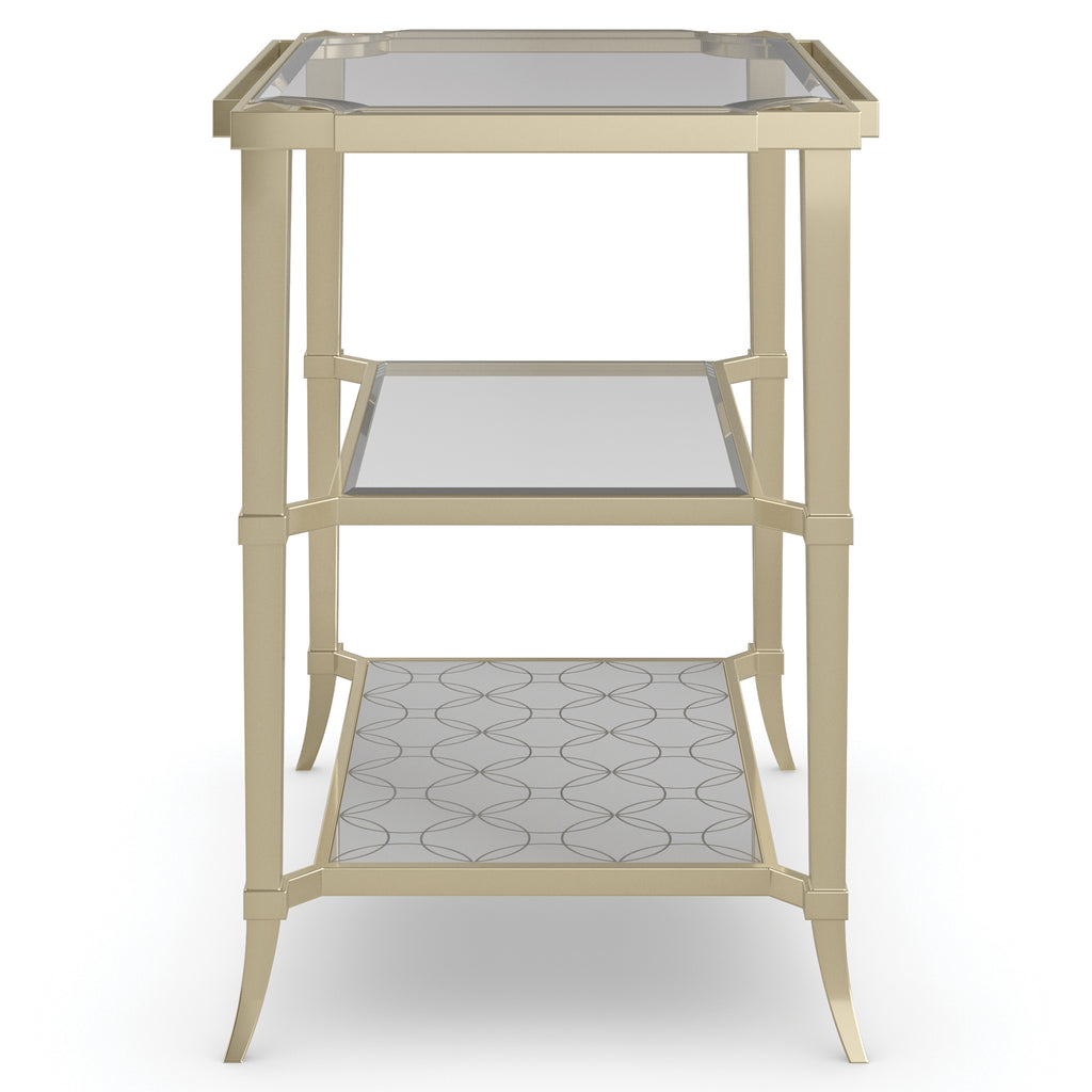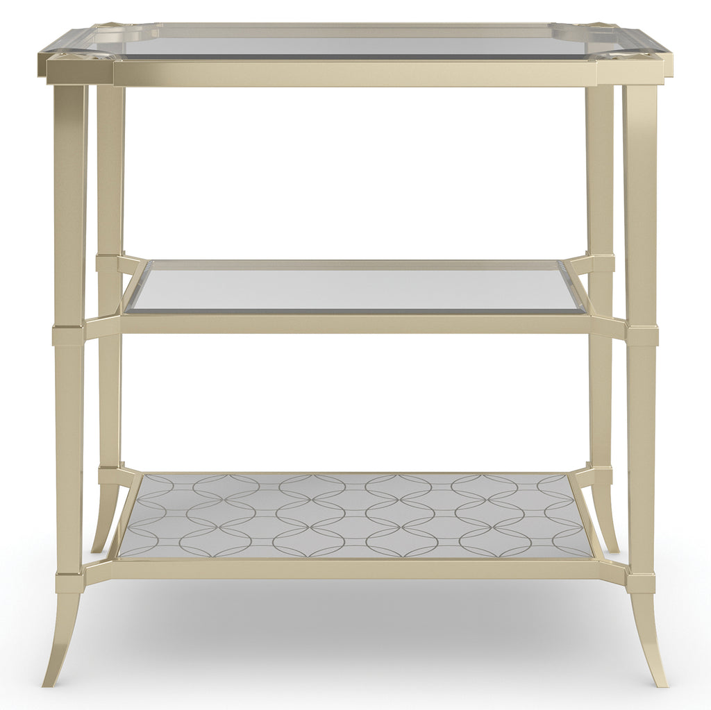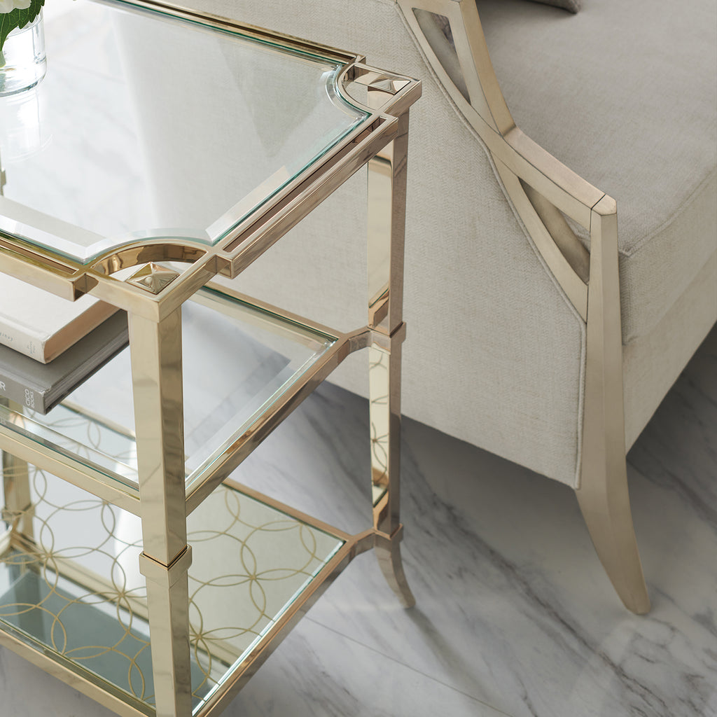 Artfully adorned in a Whisper of Gold, this tiered end table mixes intricate details with clean lines and luxe materials. Square metal legs are perfectly positioned to offset arcing corners and uphold a beveled glass top set within a slender, double frame. Adding intrigue: a mirrored bottom shelf with a repeating geometric pattern etched in Soft Silver leaf. Light and effervescent with an air of elegance, it makes a captivating addition to seating areas, whether on its own or styled in pairs to accompany our Prince Charming cocktail table.