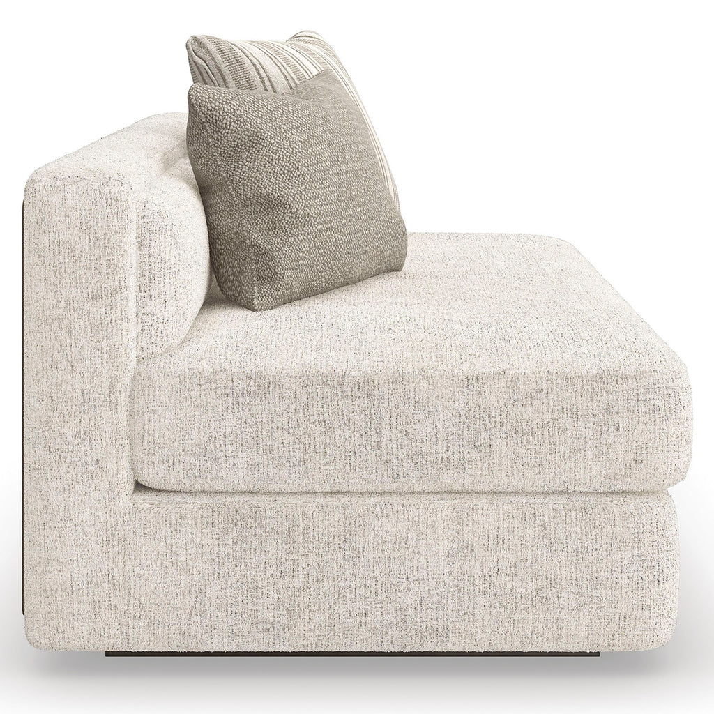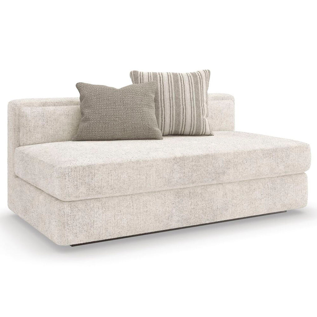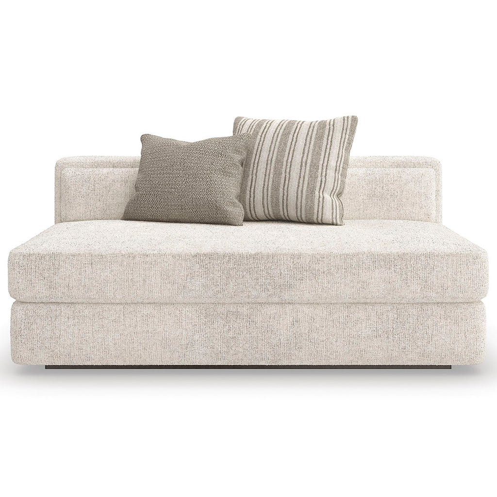 A holistic expression of design integrity, the Caracole Unity sectional mixes singular elements: organic tones, contrast, and texture to create a sense of harmony. Clean lines call to mind a modern European style, dressed in a creamy tactile fabric with a contrasting leather panel outback. Introduces a low, lounge-like aesthetic with lumbar cushioning along the back and feather-down toss pillows for added comfort and layering.