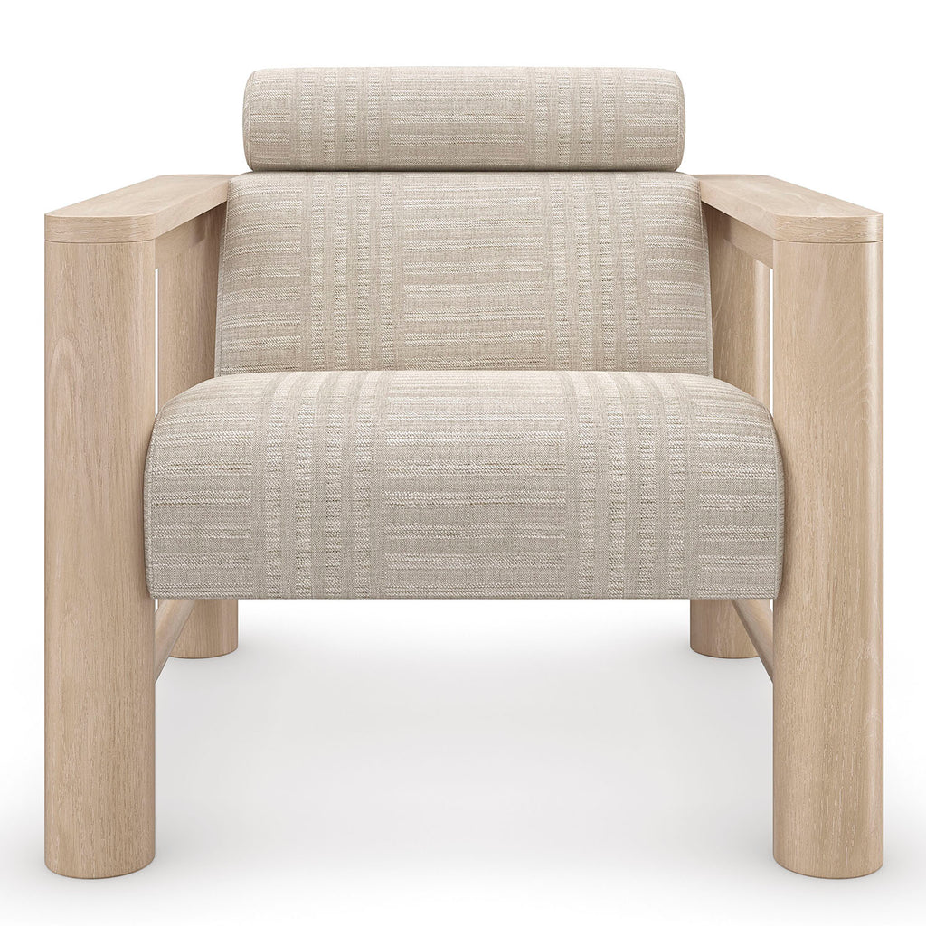 With a luxe, lounge-like aesthetic, this statement-maker exemplifies a unity of materiality, form and function. Features a pillared Sun Drenched Oak frame, softly contrasted by a tactile fabric that introduces a subtle stripe pattern. Style on its own, or in pairs to create a cozy space for laidback conversation.